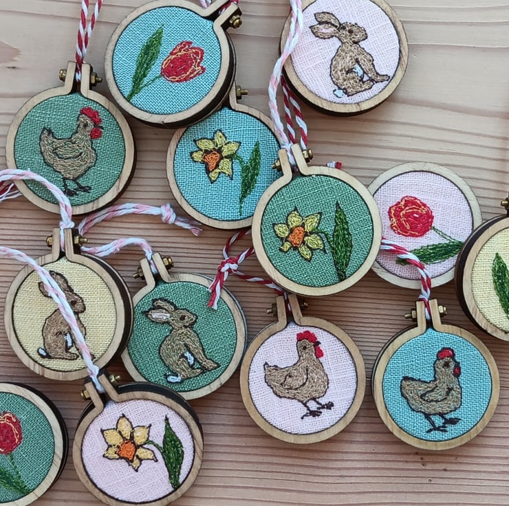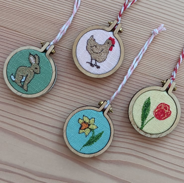 The hoop measures approximately 4cm in diameter and there is a choice of linen background - pink, green, duck egg blue or yellow.