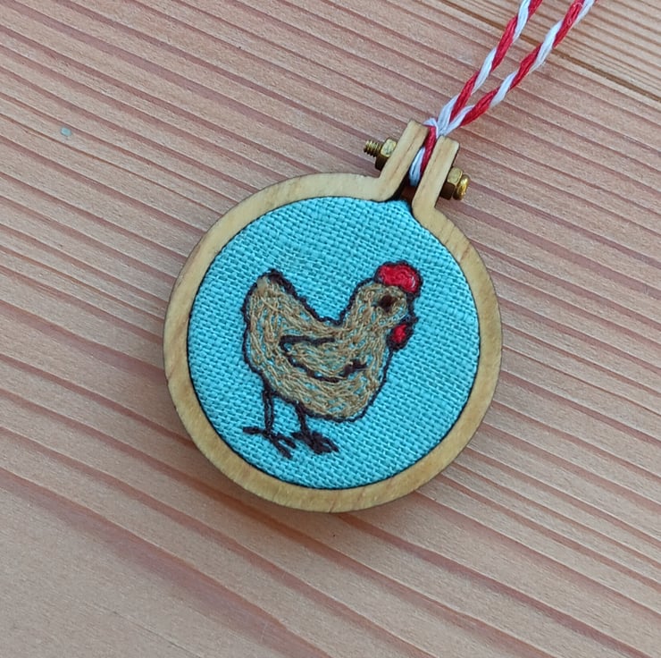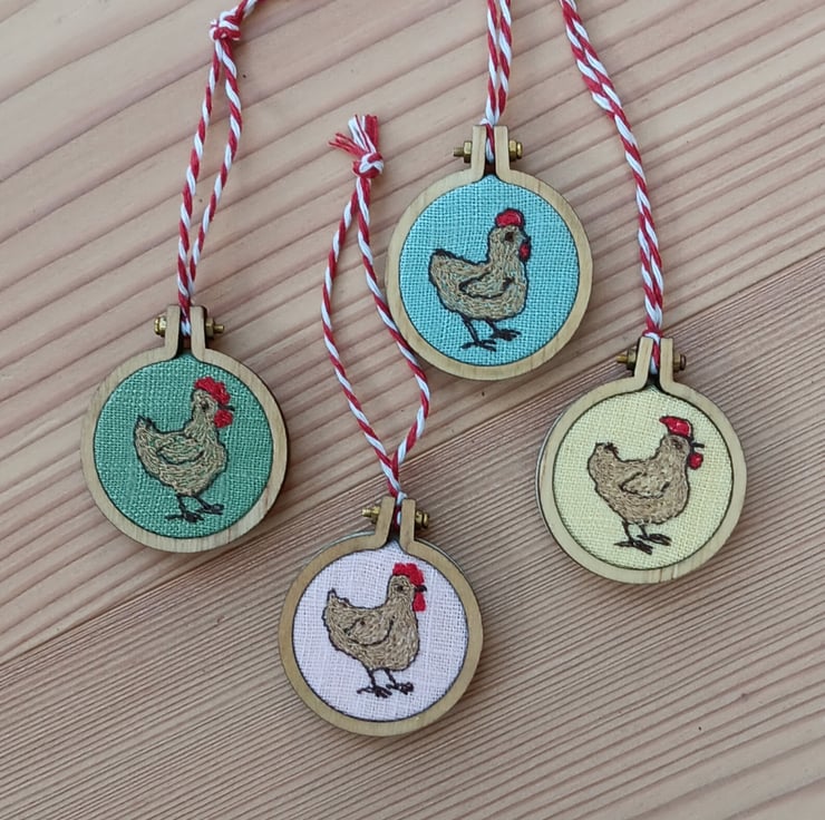 The decoration is made by stitching the design onto linen using free motion embroidery in different coloured threads. The embroidery is then placed in a tiny embroidery hoop and a colourful stripy string added. There is a wooden disc glued onto the back for a neat finish.