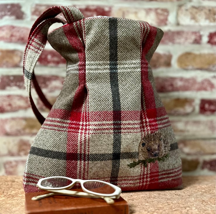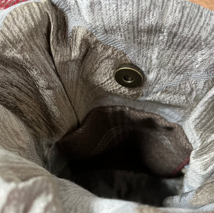 This shoulder bag has been made from a textile of a red, taupe, cream and charcoal check which was a curtain sample in a previous life. As I buy textiles as and when I see them, I’m not always certain of the exact fibre content.