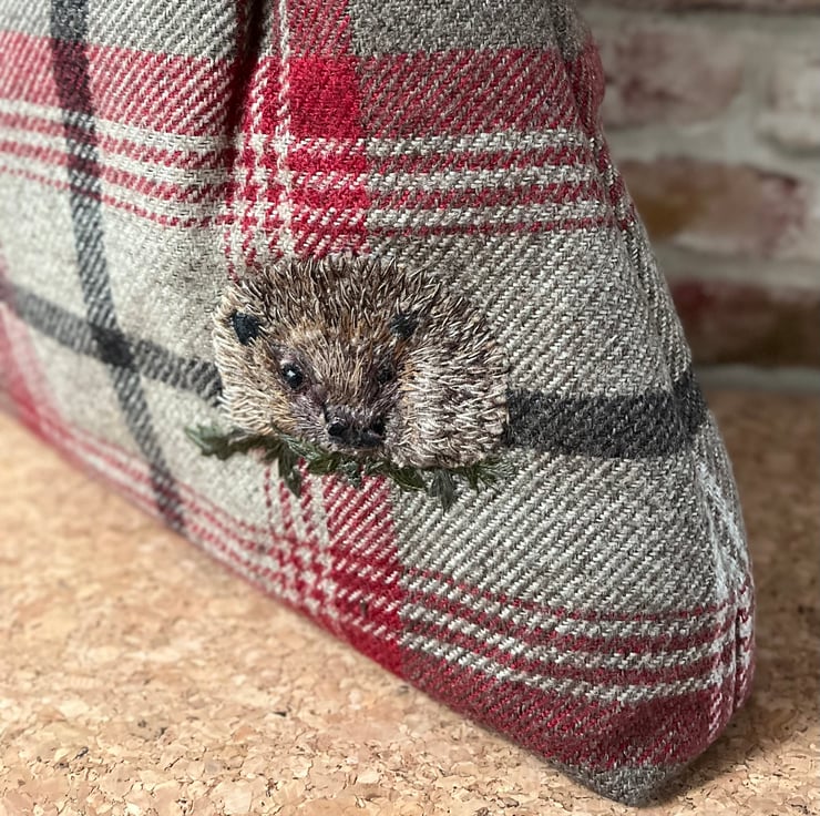 It has been decorated with a hand embroidery of a hedgehog among the leaves.