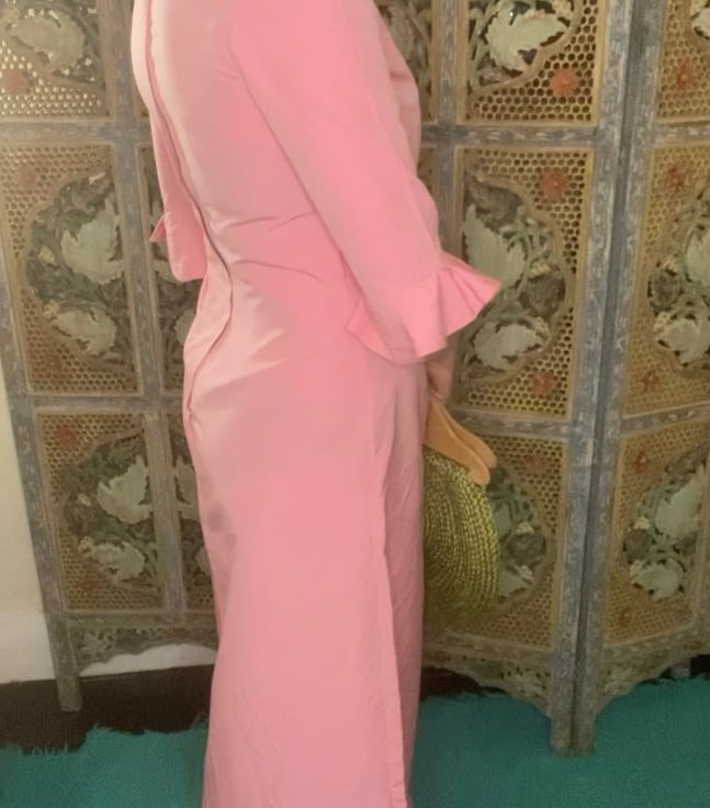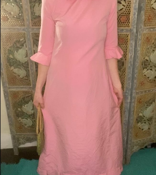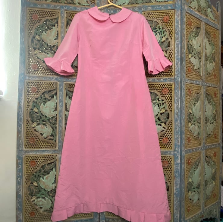 A handmade silk dress with pixie collar and fluted sleeves.