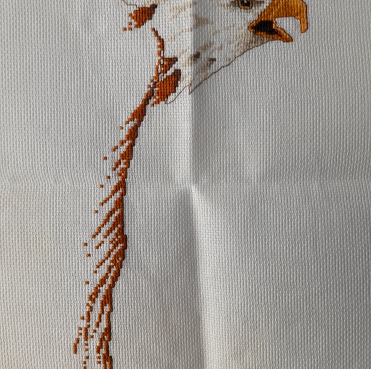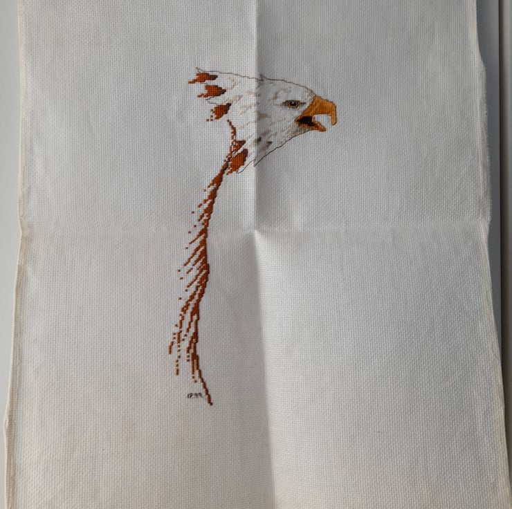 4 x 9 inch cross stitch of an eagles head. Unframed and embroidered onto a cream linen backing.