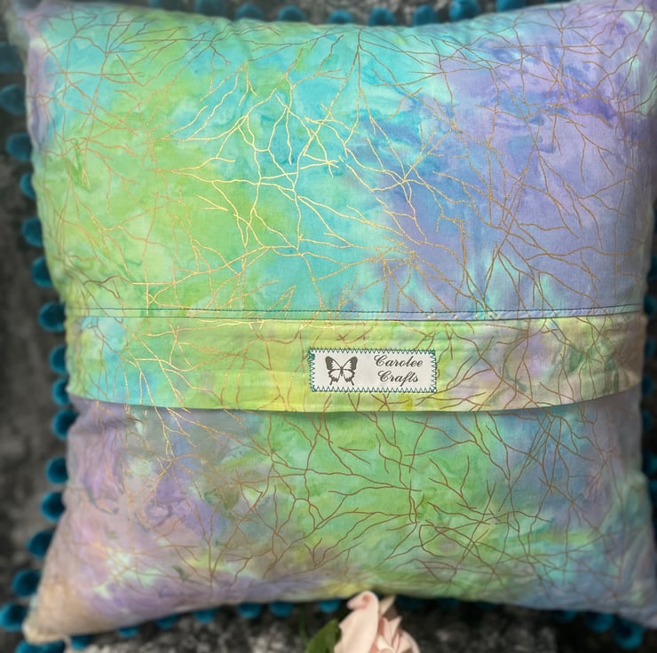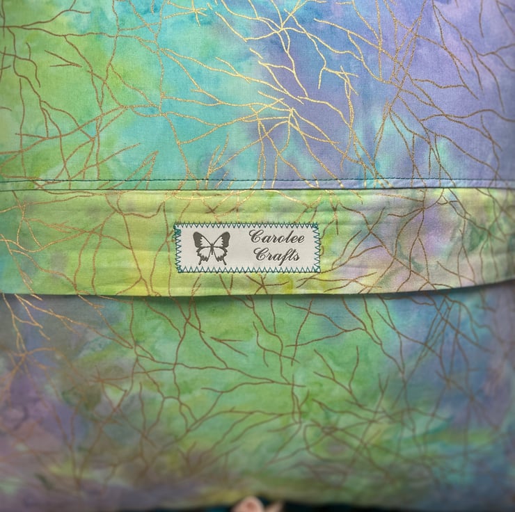 of turquoise, lilac and gold. Hidden zipper on the back. Fully lined with pale green cotton.