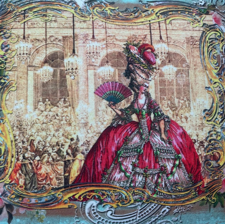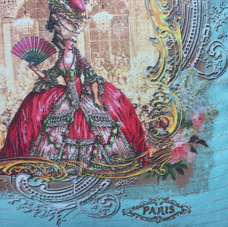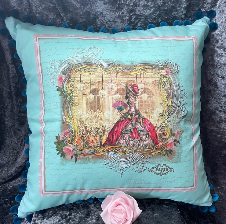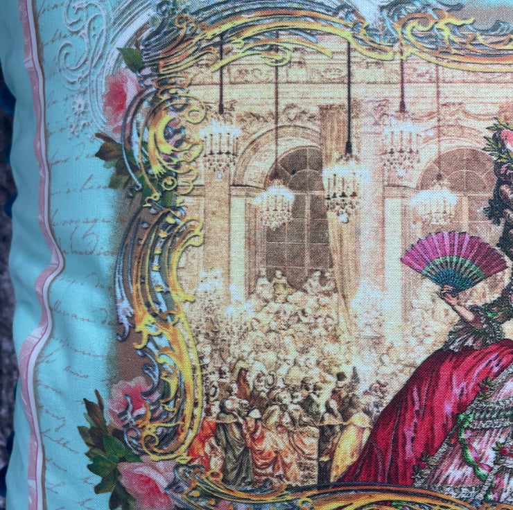 Beautiful turquoise cotton. A Marie Antoinette themed cushion cover depicting a crown of her admirers due to a ball in Versaille in all their finery. Edged with turquoise Pom poms.