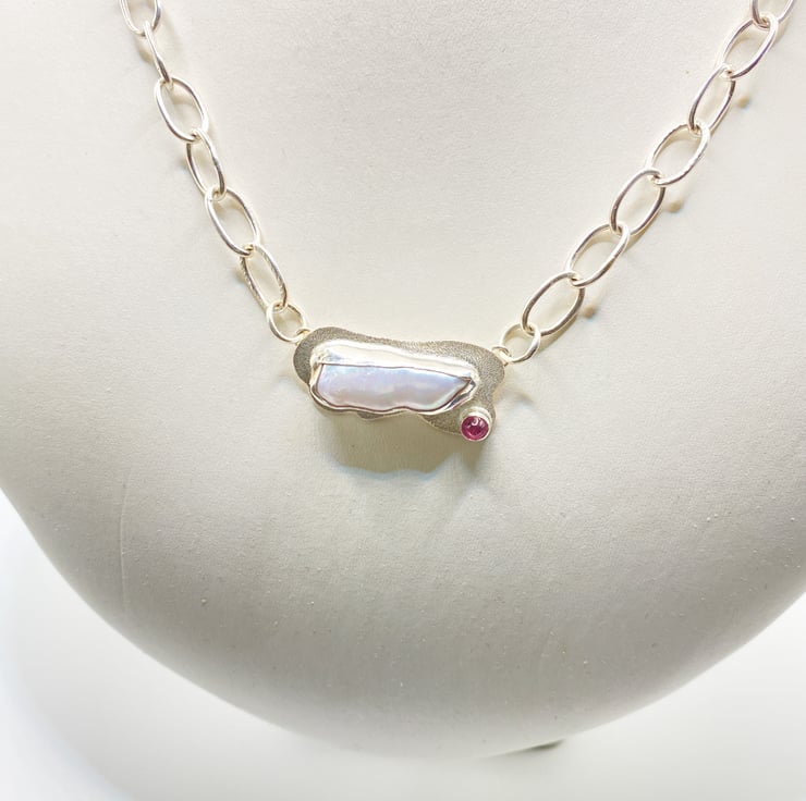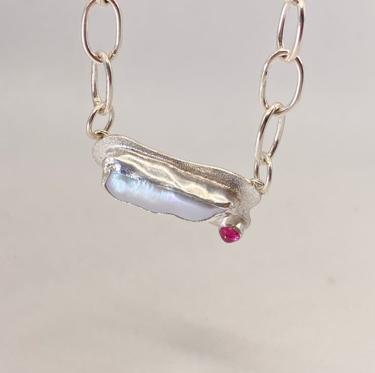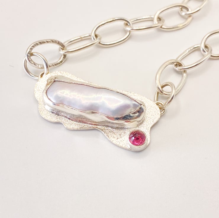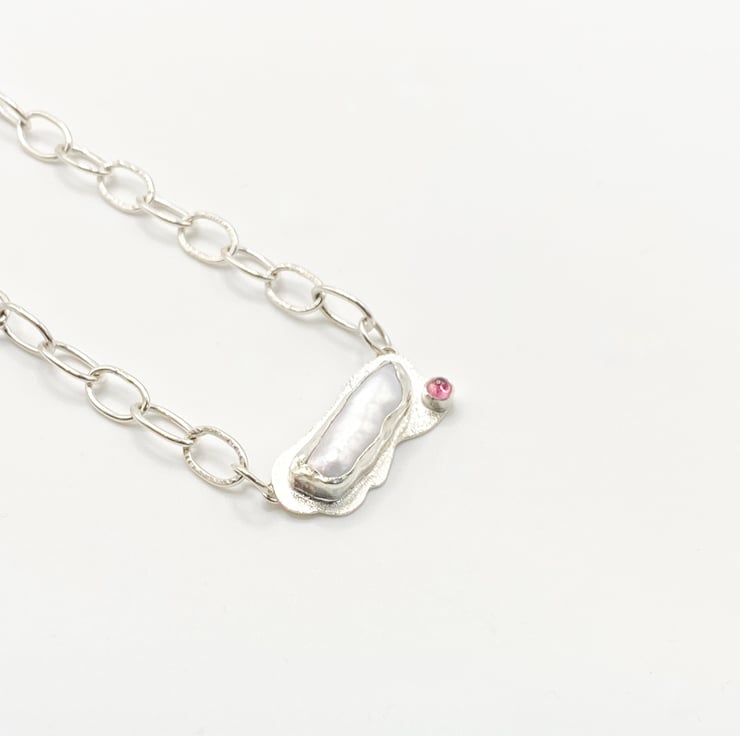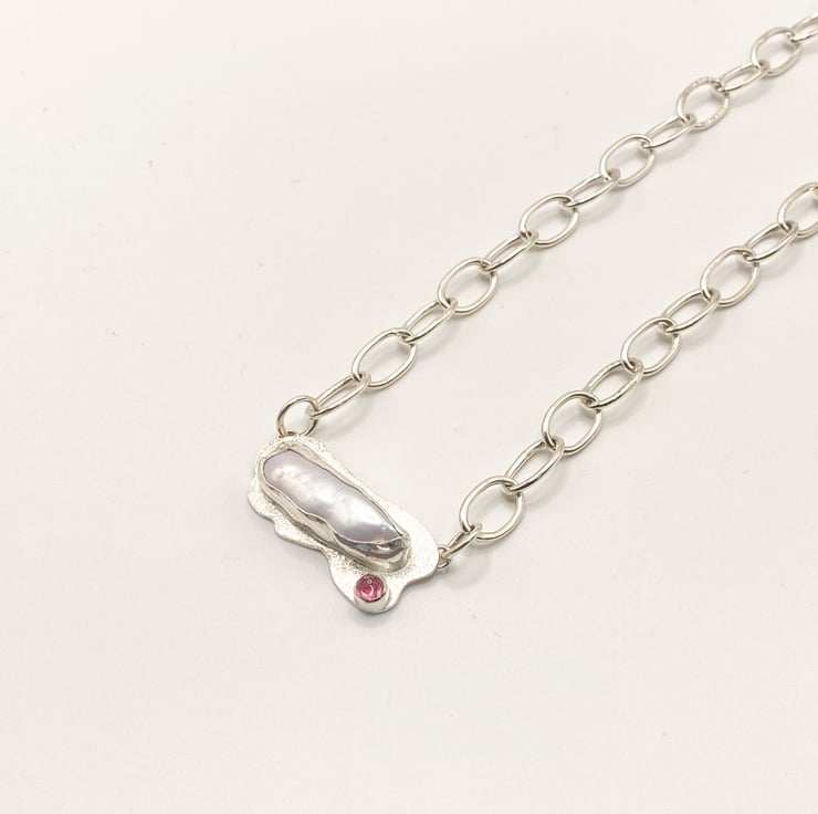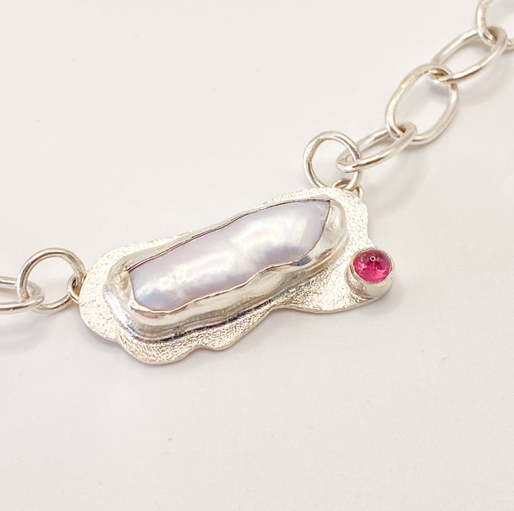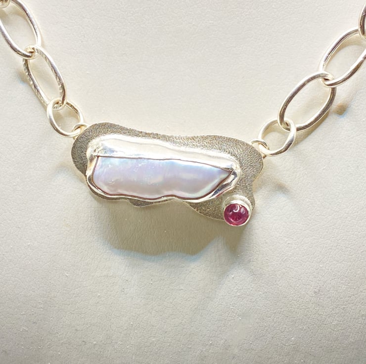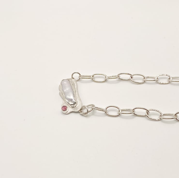 Paired with the warm, rosy glow of pink tourmaline, this necklace feels like something found at the edge of a sun-dappled meadow — light, fresh, and full of possibility. The pink stone, soft as petals, contrast beautifully with the natural shimmer of the pearls, creating a piece that feels as if it were meant to be worn in the wildest, most wonderful places.