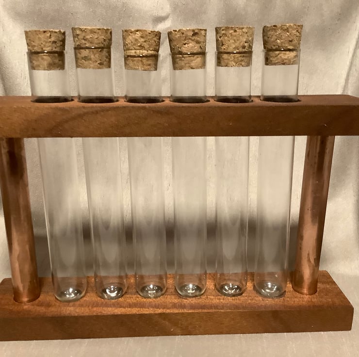 Just finished, a gorgeous handmade Test Tube Spice Rack, made from reclaimed Marengo hard wood with 6 glass test tubes with cork stoppers and copper piping as struts. This could also be used as a bud vase or plant Propagator