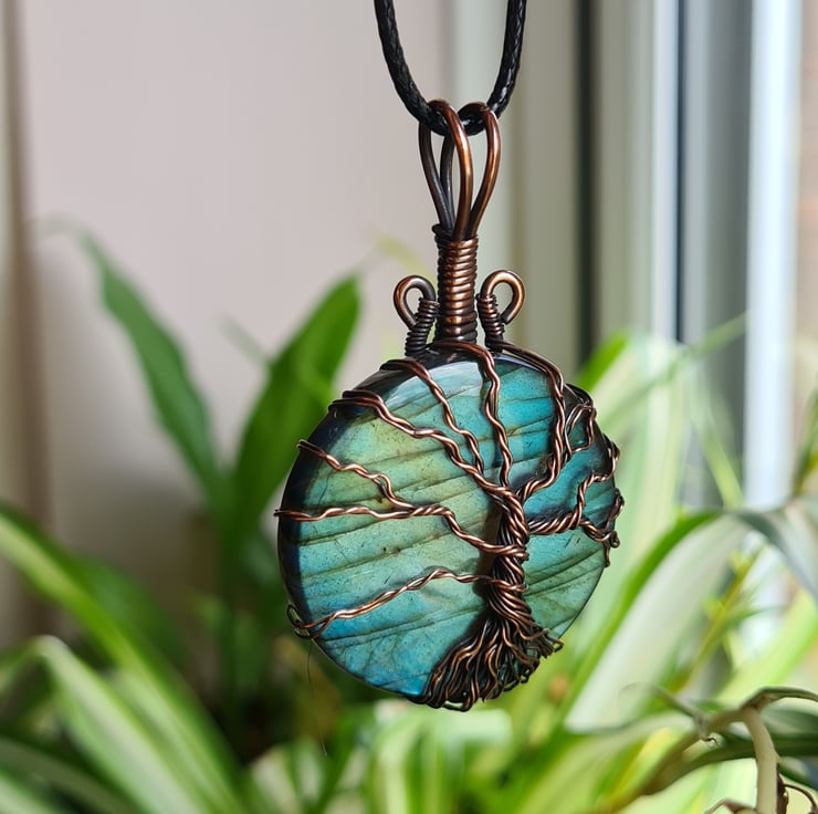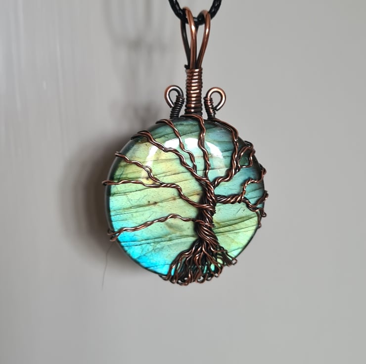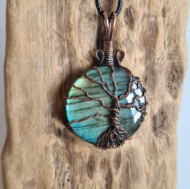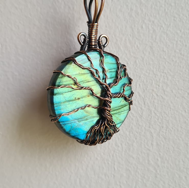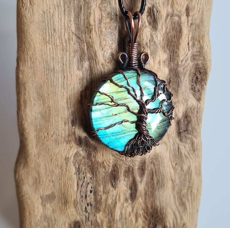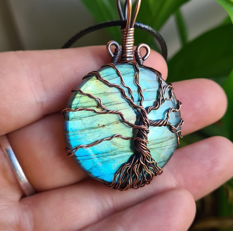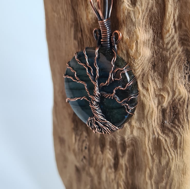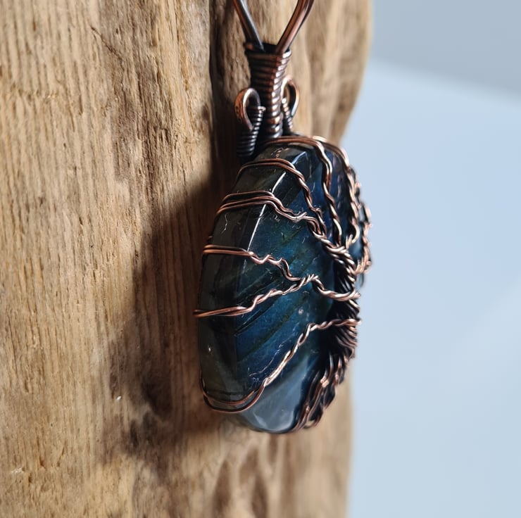I have created this beautiful and very unique Tree of Life Statement pendant using this beautiful Natural blue Labradorite crystal, which I have wrapped with copper featuring this gorgeous copper tree to the front. This crystal has a beautiful colour and flash and looks amazing teamed with the copper and the tree and bail have been set slightly off to the right giving the tree a very unique look.