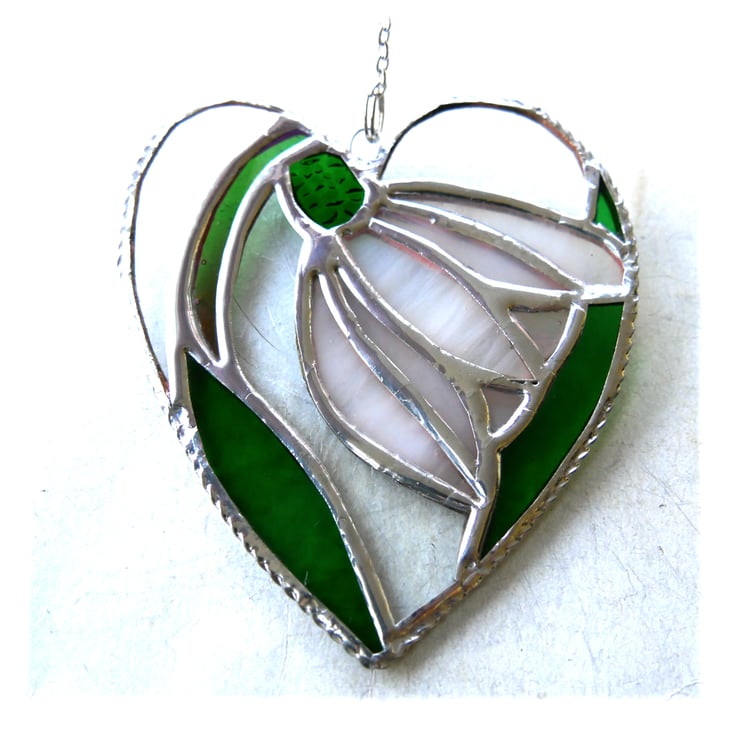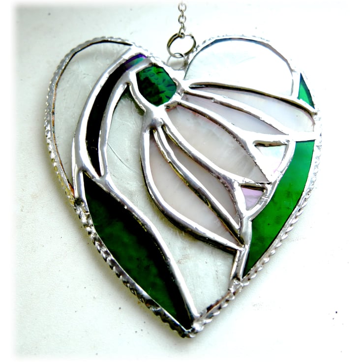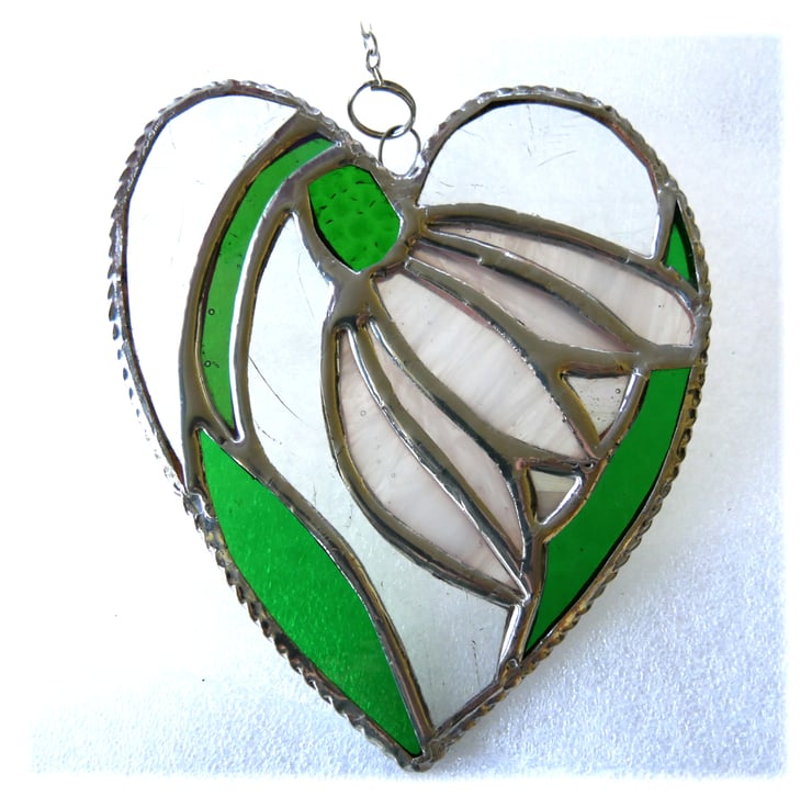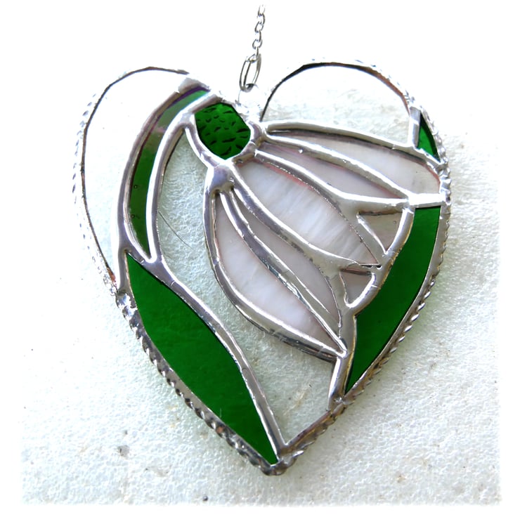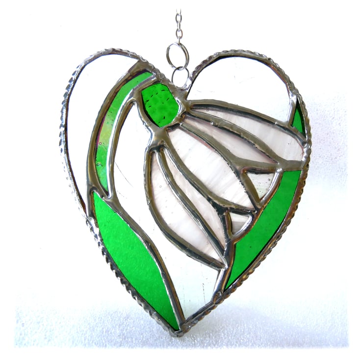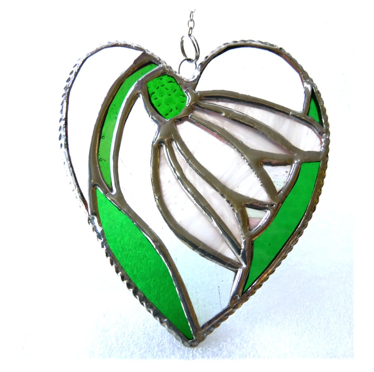 One of my flower heart range. A snowdrop, icy white with thin strappy green leaves. The flower is enclosed in a heart shape with the surrounding glass in clear, pretty frost patterned glass.