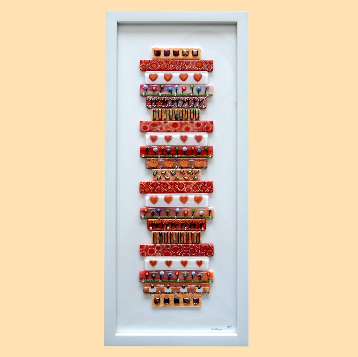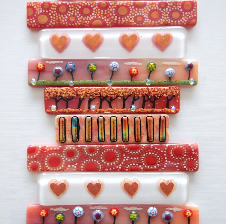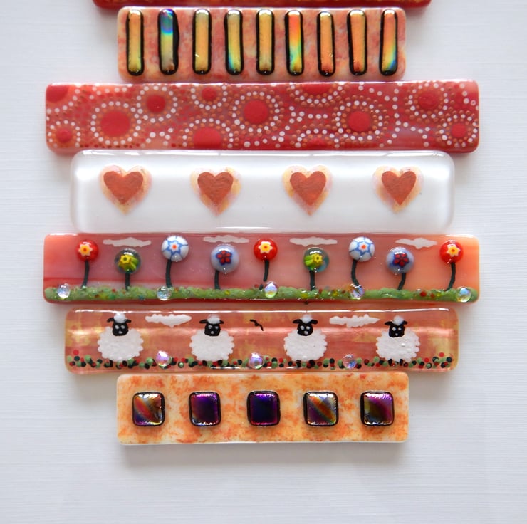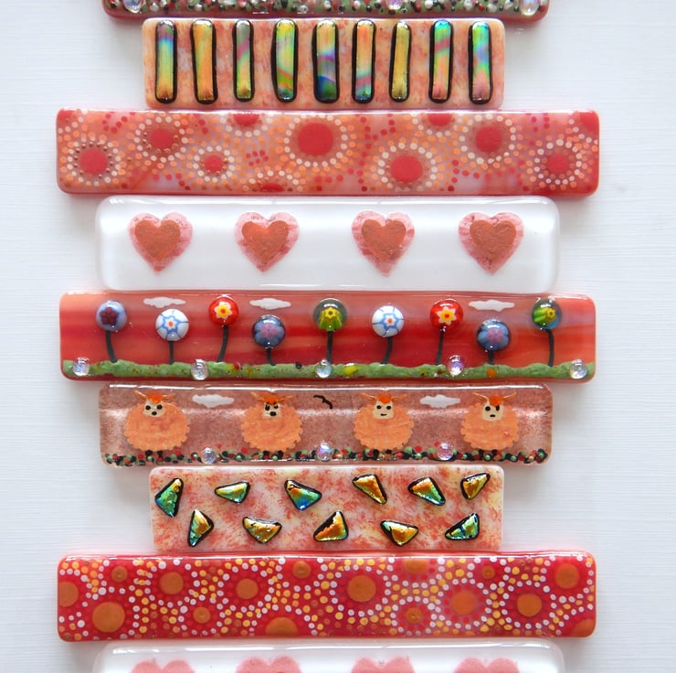 This picture is really 21 miniature pictures in one. It took a fair bit of time to make as each image was individually crafted. The 21 mini-pictures were then assembled on a broad strip of bullseye glass. They were fired in my kiln for 12 hours to allow each image to fuse with the background glass and its neighbour. This picture took two firings to get it to the high standard that I expect from my work.