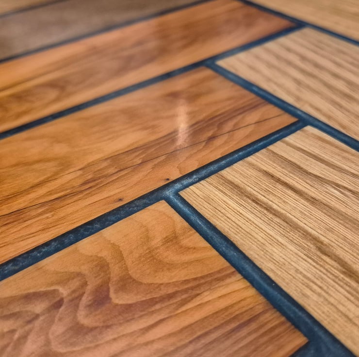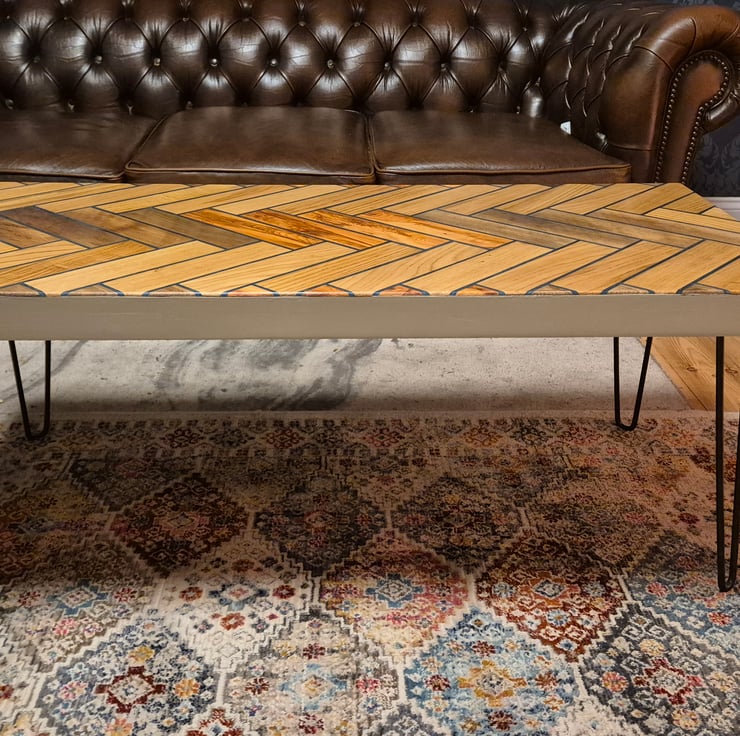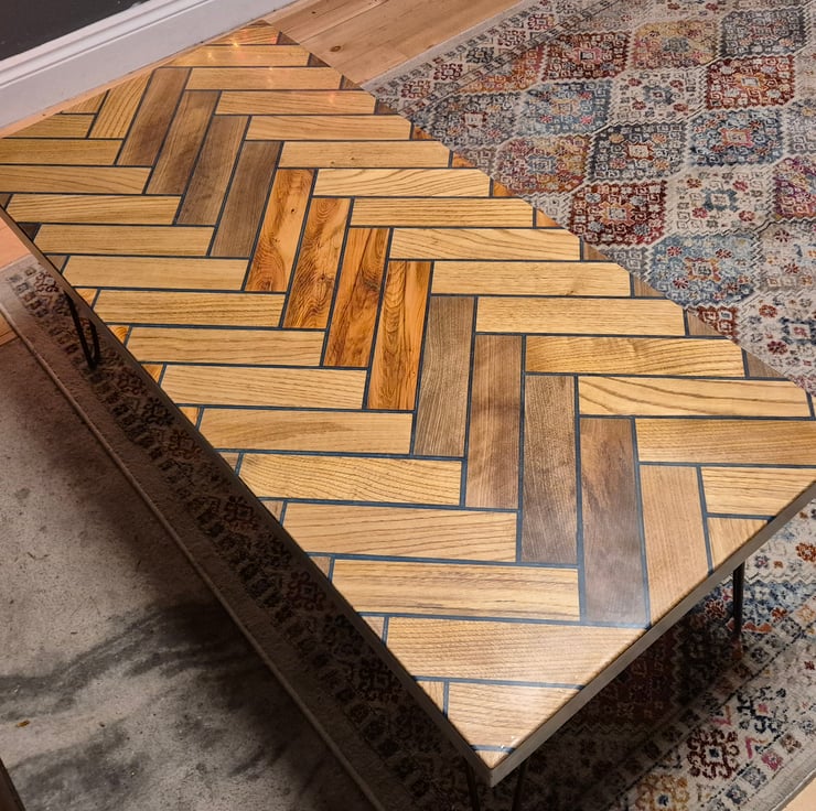 The example shown contains chestnut, walnut, and yew. However it can be customized on request with wood types as desired, alternate legs, or even have a different pattern entirely!
