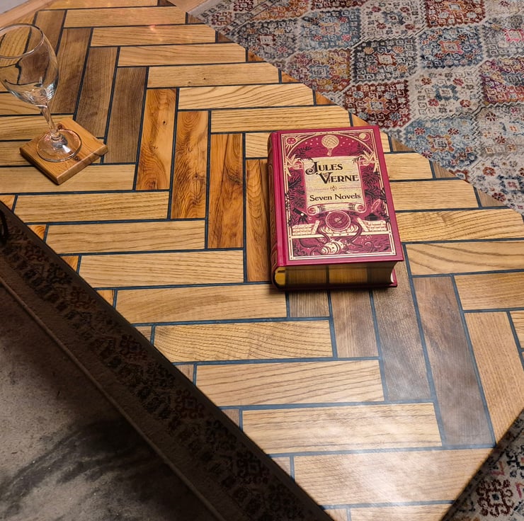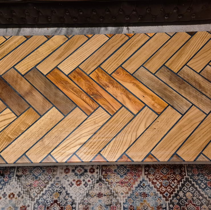 This beautiful coffee table is constructed from several wood types, laid within a shimmering blue resin.