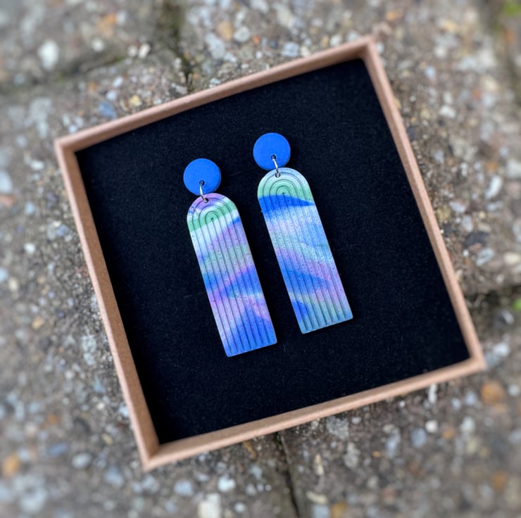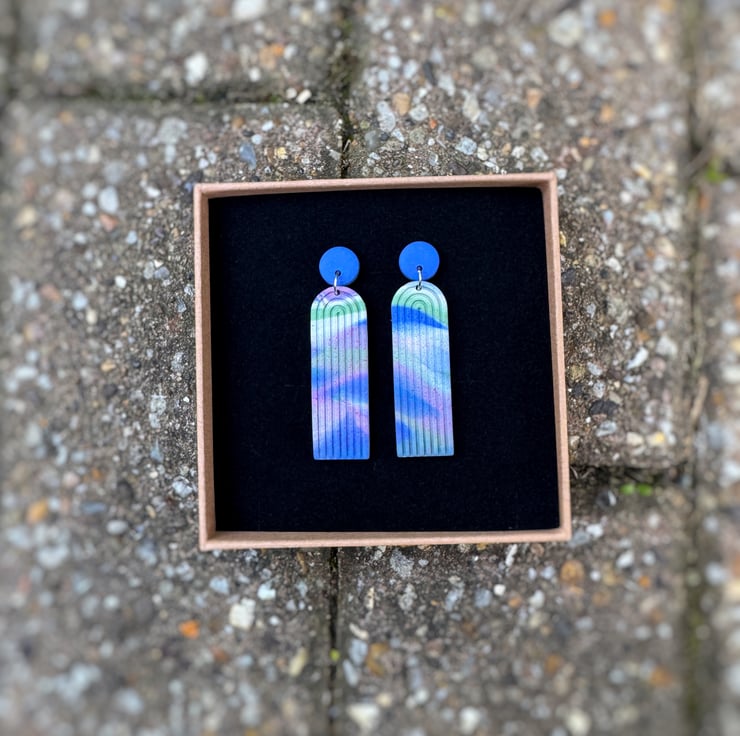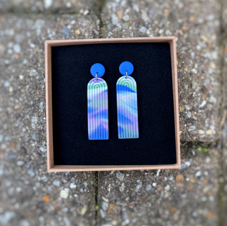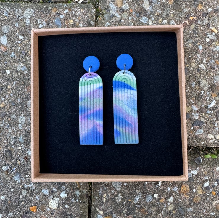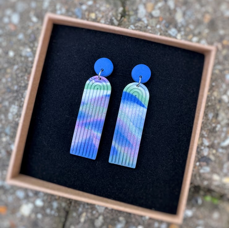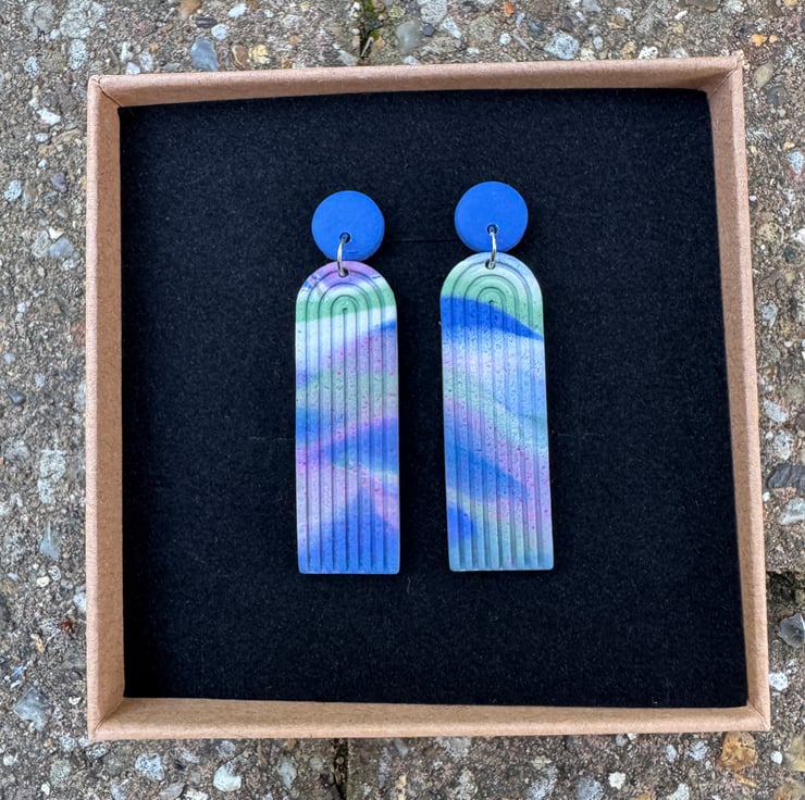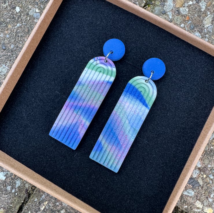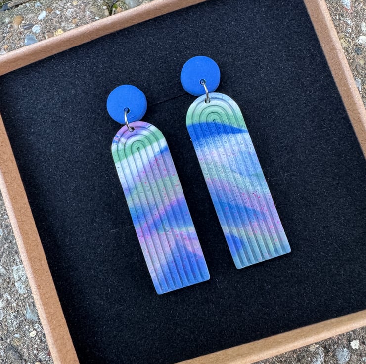 Made from repurposed remnants of polymer clay, forming a unique colour palette of aurora type design in lovely muted haze hues