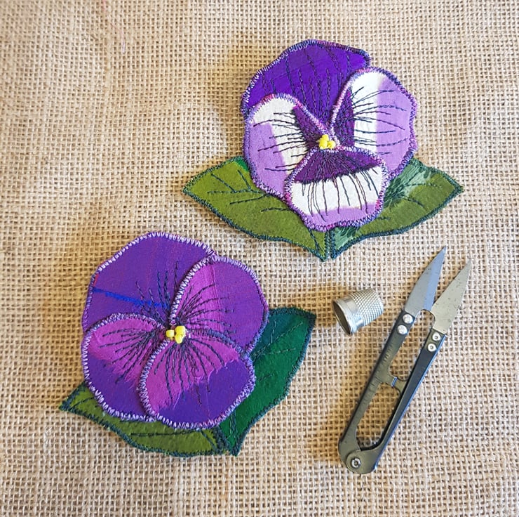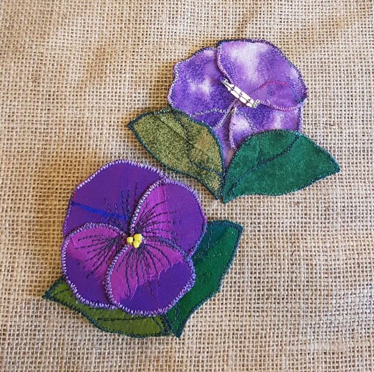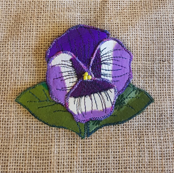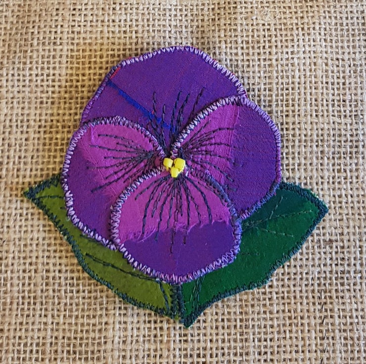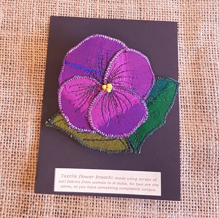 These textile brooches are made by stitching silk sari ribbons and remnants onto hessian. I have changed the way I make these and now each individual petal and leaf are made separately and stitched together. This gives the petals and leaves greater depth and makes for a more textured finish. Each brooch is backed with a coordinating cotton.