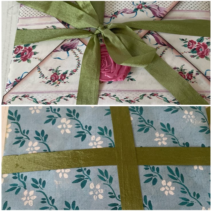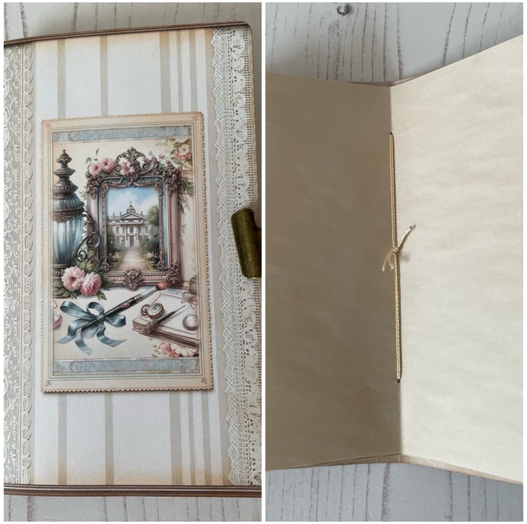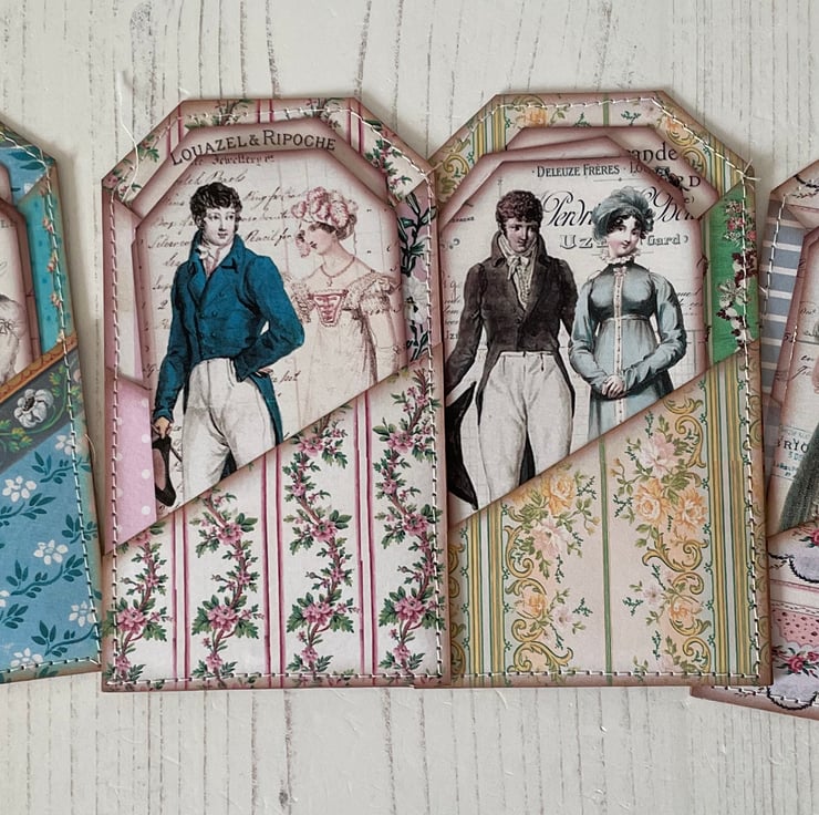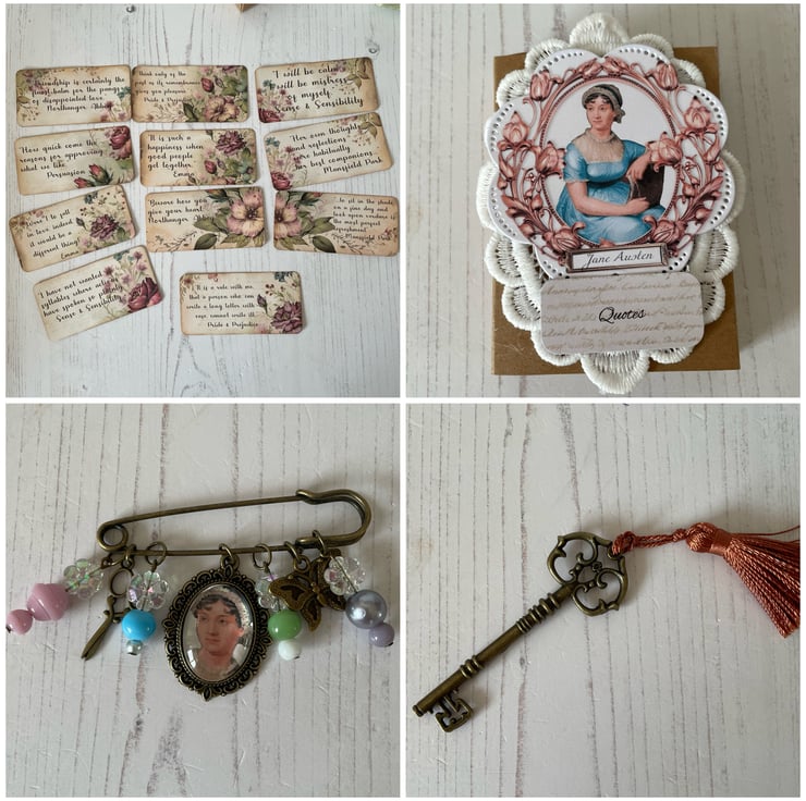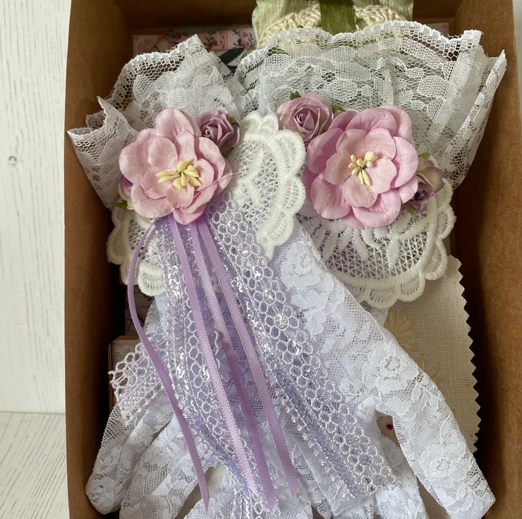 A handmade kraft card box, decorated with pretty papers, topped with an image of Jane Austen, lace, wording and paper roses. Opens to display a selection of handmade curated items applicable to the Regency Era. A pair of lace gloves decorated with doilies and flowers in lilac. Mini journal, with coffee stained paper, clipped with a vintage bull dog clip, lave and tassel. Bundle of letters and notes in pretty envelopes, wax seal and tied with sage ribbon. Mini hand ribbon embroidery snippet. Silk purse and handkerchief with pocket. Set of 4 pockets and 12 tags. 2 lavender sachets in silk tied with ribbon and a doily. A handmade kraft matchbox with quotes, kilt pin brooch and a key with tassel.