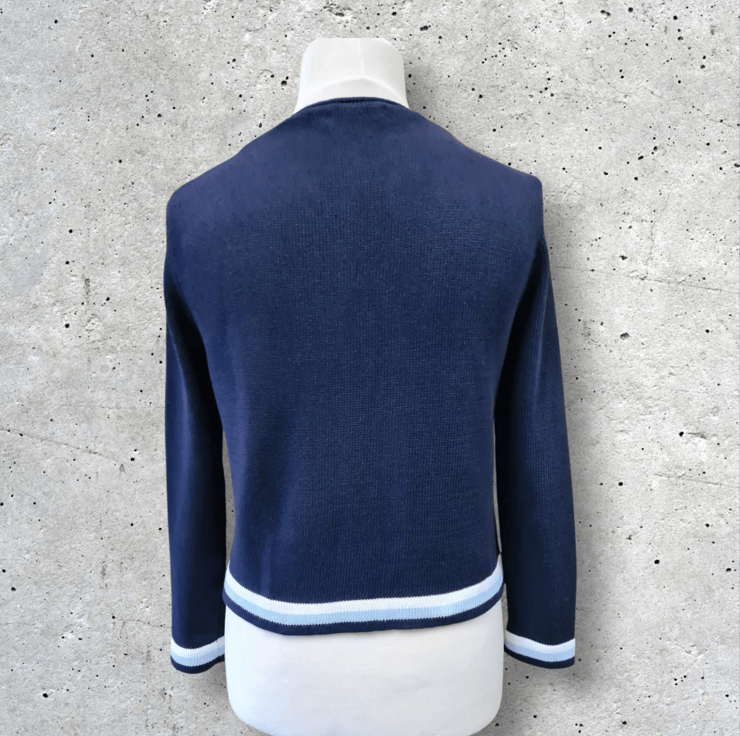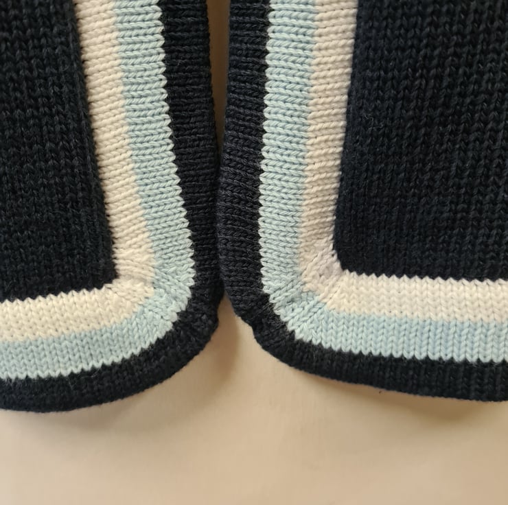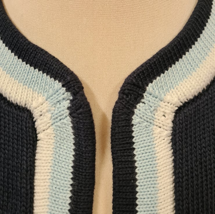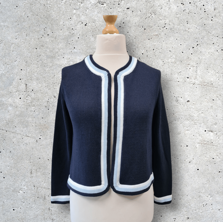 A long sleeve edge to edge cardigan with contrast bands. 100% cotton. Size 12
