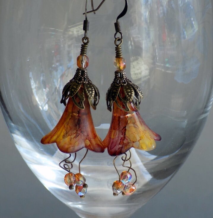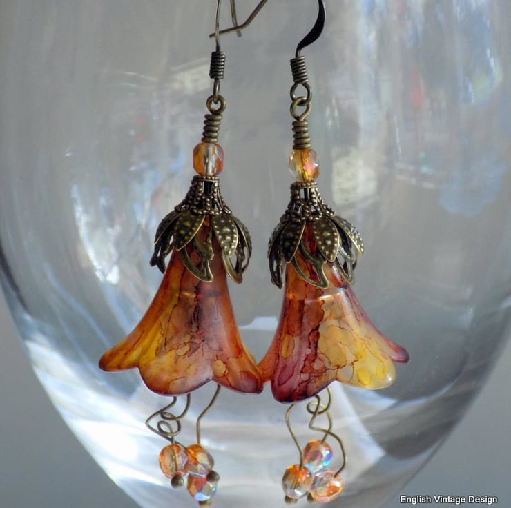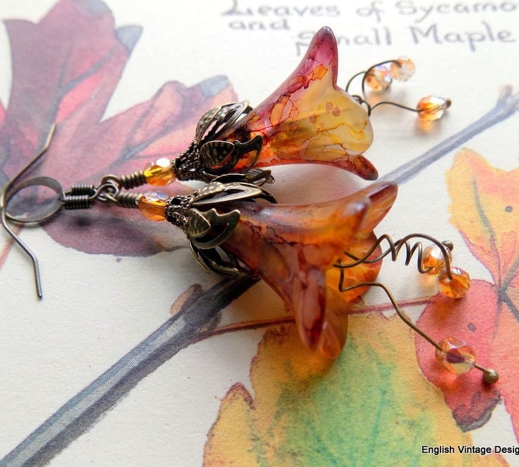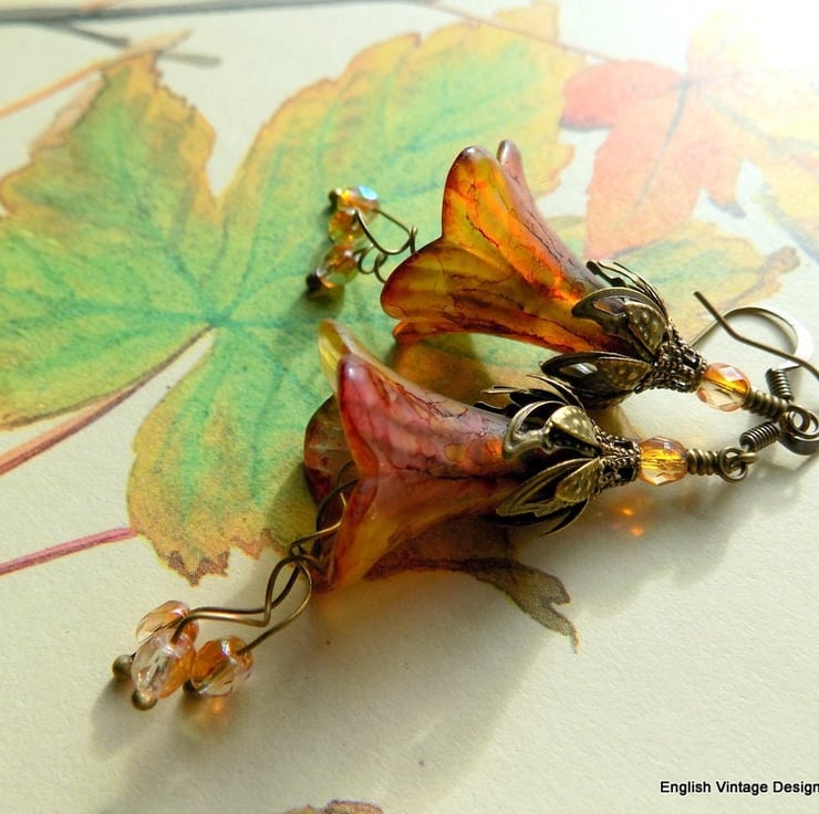 'Autumn Maple' is exclusive to English Vintage Design; these lovely earrings feature my larger lucite bell flowers in a blend of yellow and dark red-purple, with layered antiqued bronze, filigree bead caps and hand twisted stamens of Czech Glass rounds.