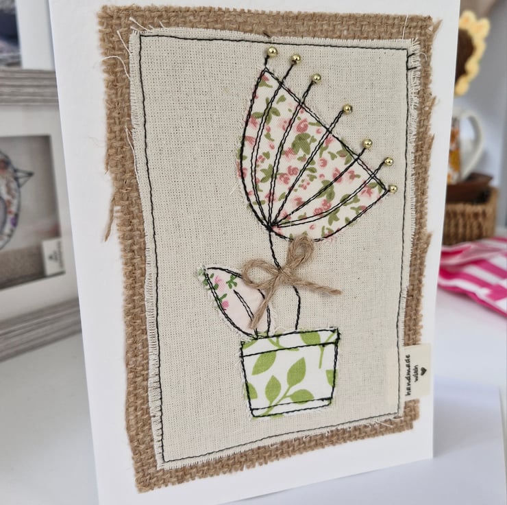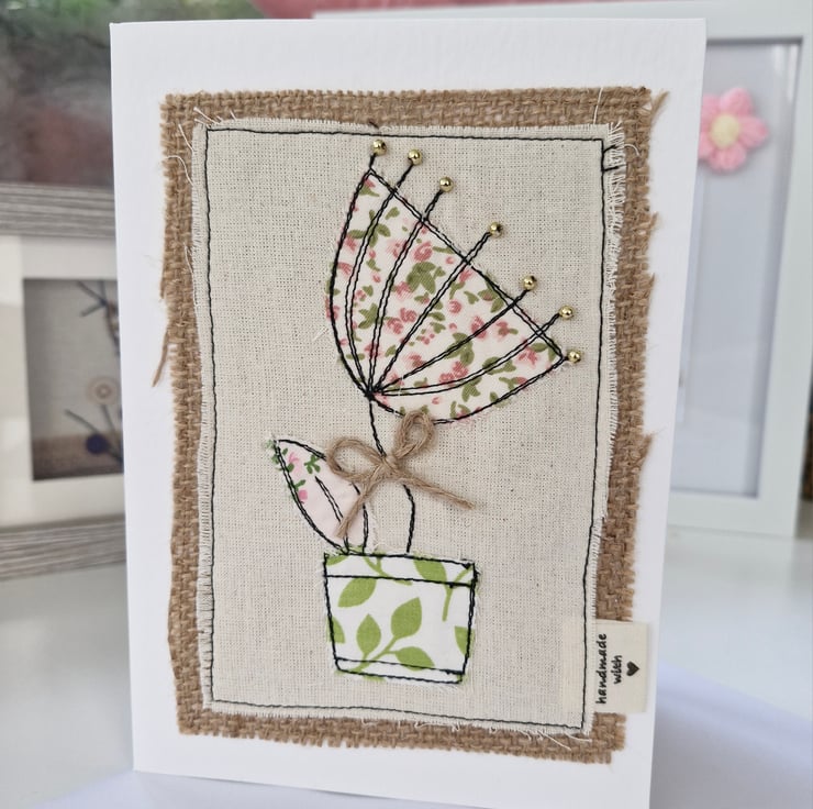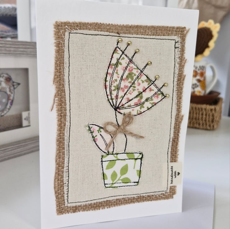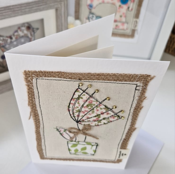 A high quality card, this features a pretty flower in a pot design. Using a free motion embroidery technique, the card has been decorated with lovely embellishments.