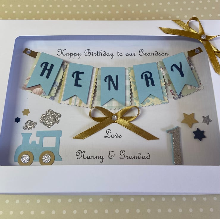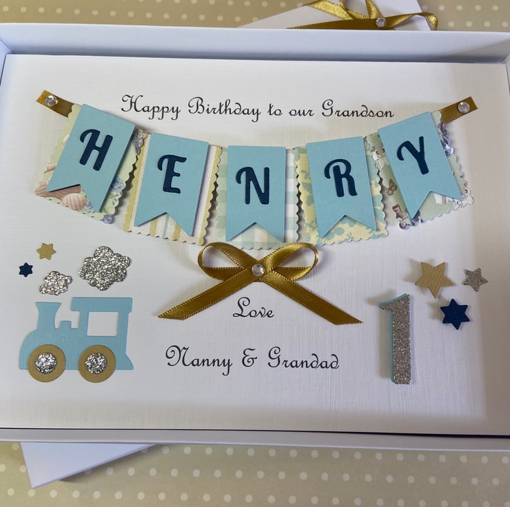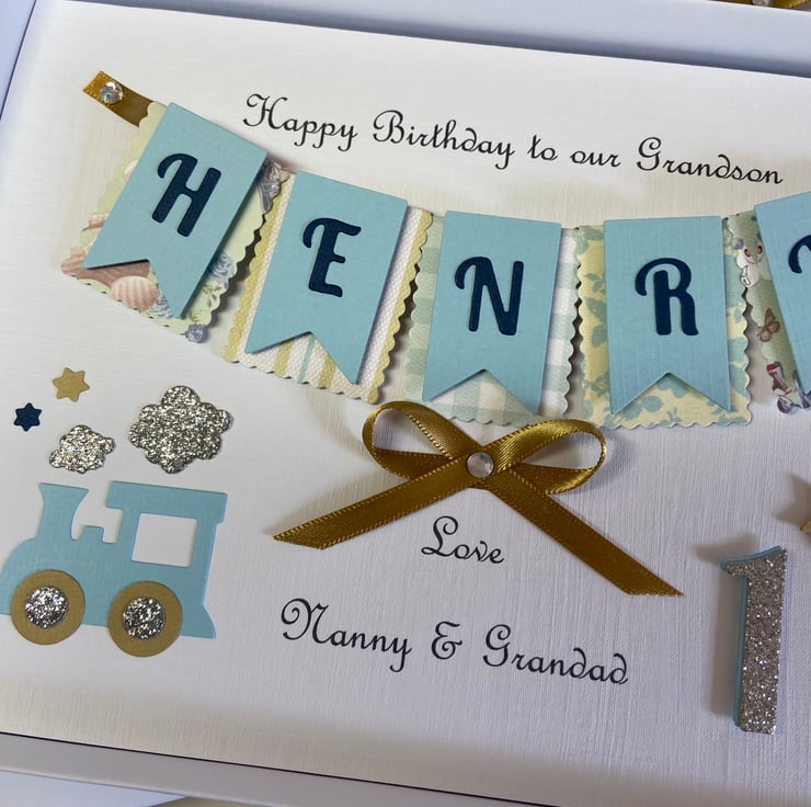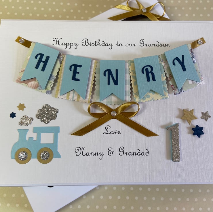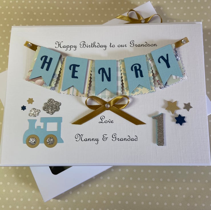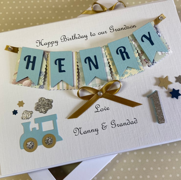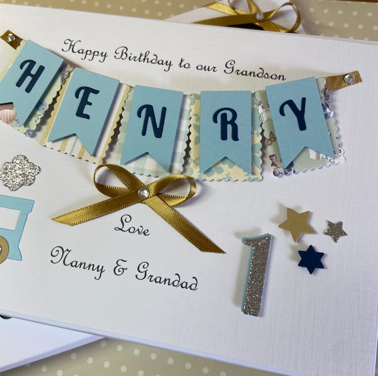 This handmade personalised card is A5 in size ( 210mm x 150mm) and is on 300gsm heavyweight linen cardstock. This bunting card can be made for any little boy’s special occasion and can be for any age. I can fit up to seven letters on the bunting. The card is embellished with ribbons and gems.