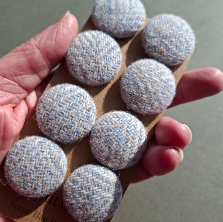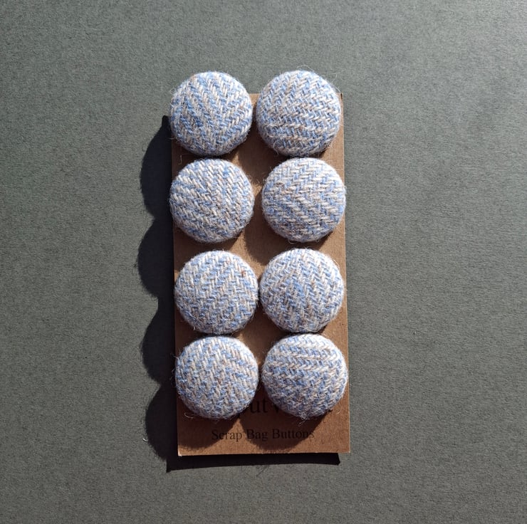 This set of eight buttons are metal buttons covered with scraps of Harris Tweed fabric in baby blue and oatmeal. Each button is around 2cm across.