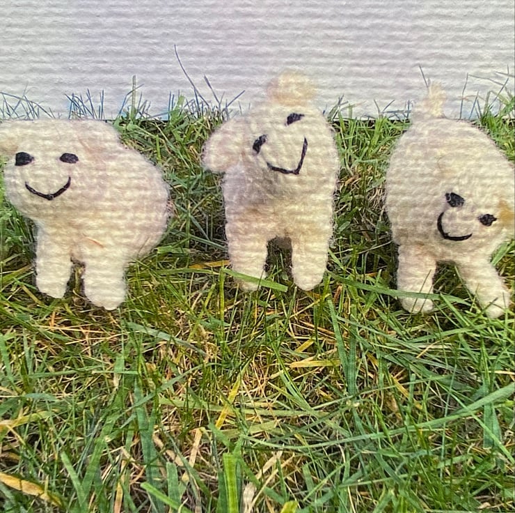An original print of my knitted sheep. I pose these in the garden, they seem to like it as they’re usually smiling!