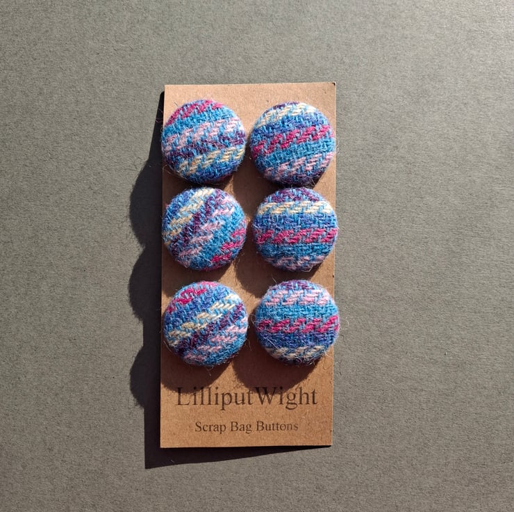 This set of eight buttons are metal buttons covered with scraps of genuine Harris Tweed in multi coloured stripes on a teal blue background. Each button is around 3cm across.