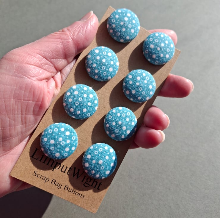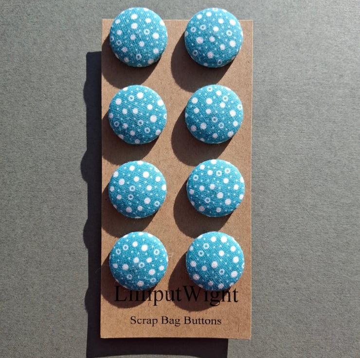This set of eight buttons are metal buttons covered with scraps of a cotton fabric in teal with a pattern of white circles and dots. Each button is around 2 1/2cm across.