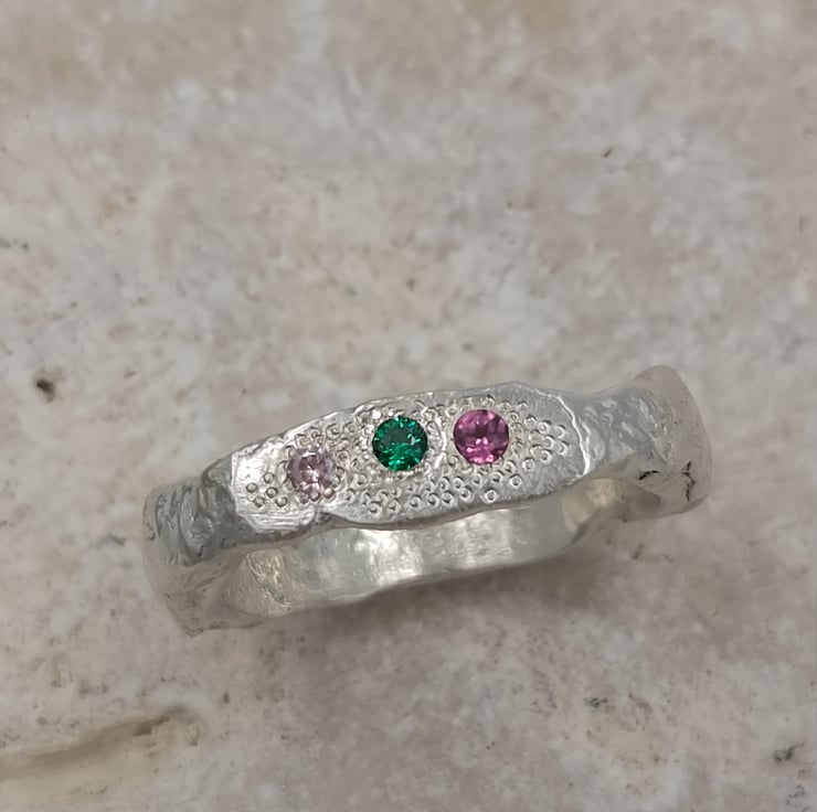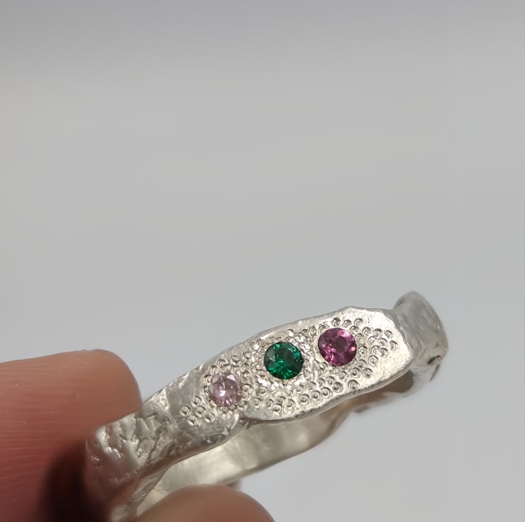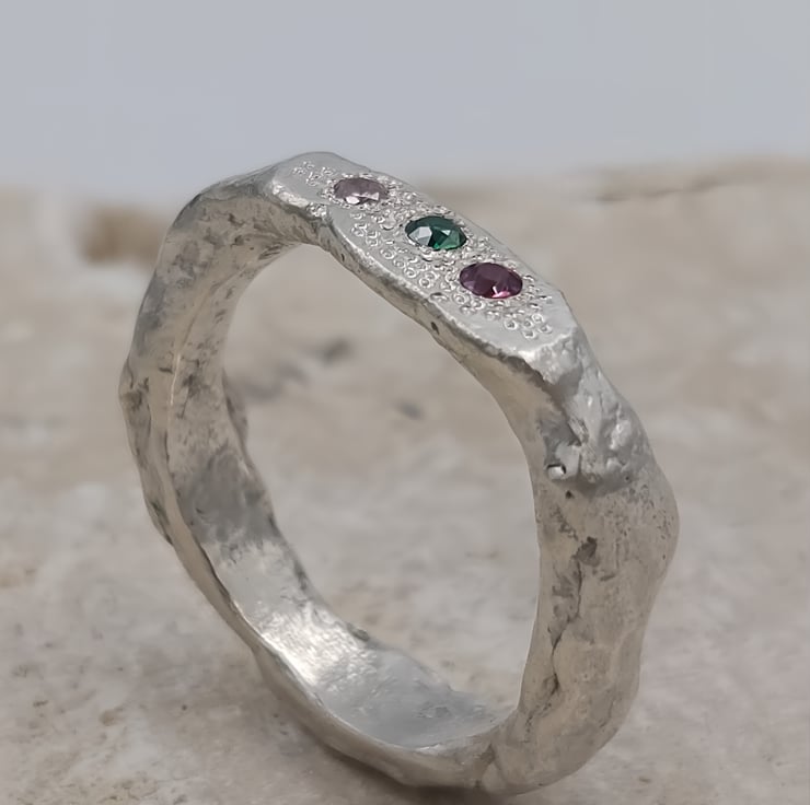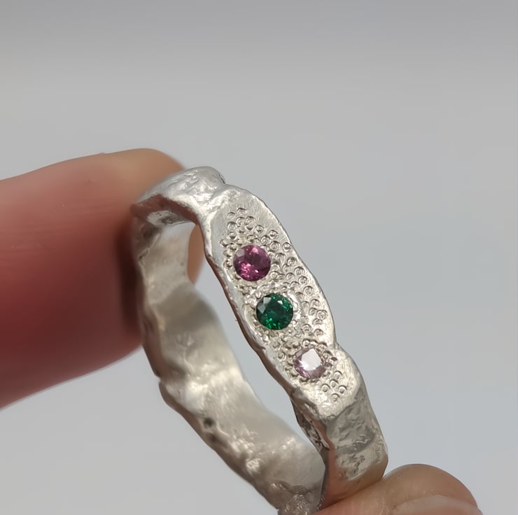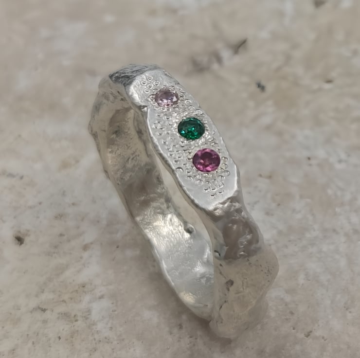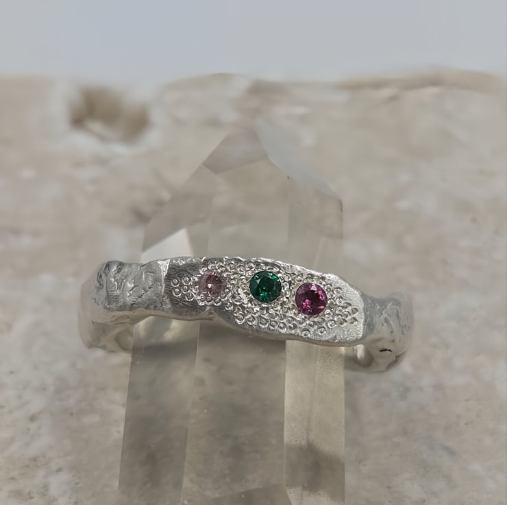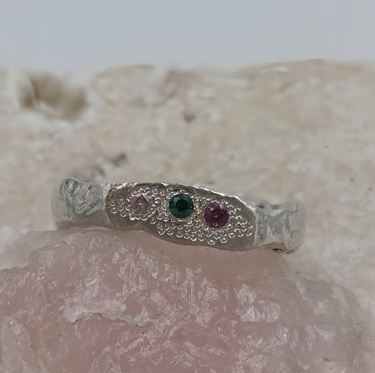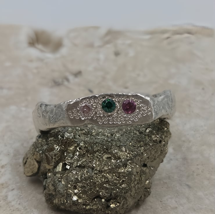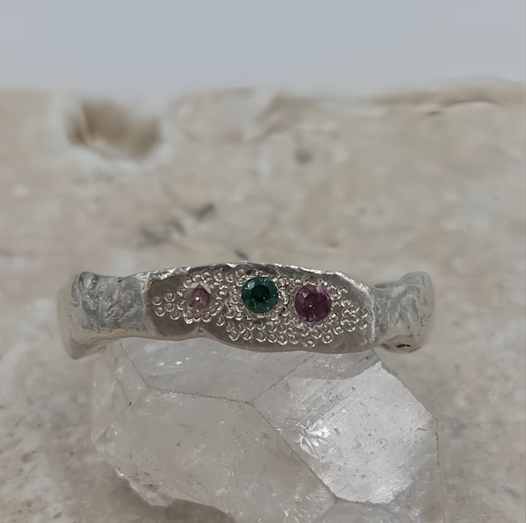 This hand-forged silver signet ring exudes timeless elegance with a modern twist. The 2mm green and pink cubic zirconia (CZ) gemstones are beautifully paired with a rhodolite garnet, creating a stunning contrast of colours. The organic, hammered texture of the silver band is carefully crafted by hand, making each piece unique.