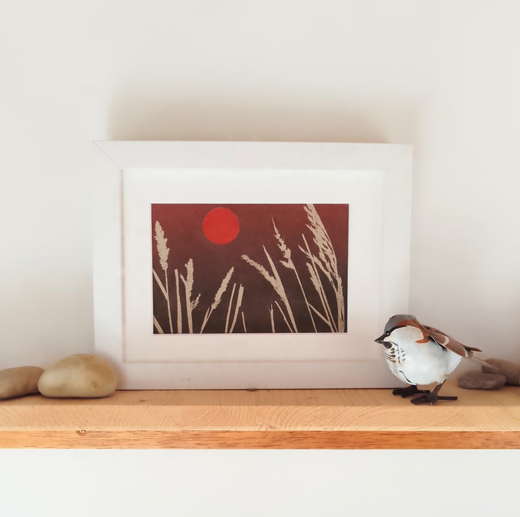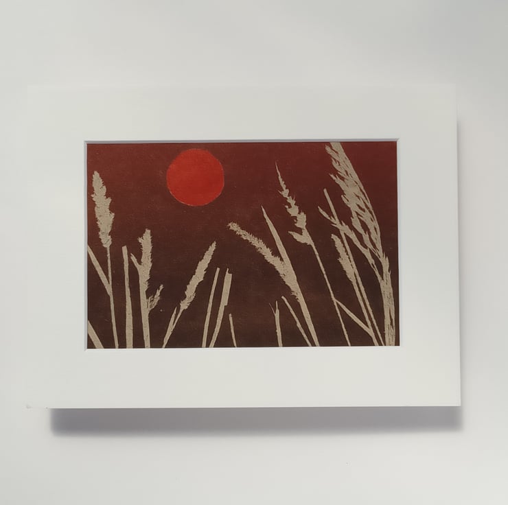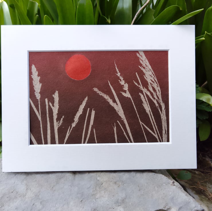 A small monoprint of grass heads against a red sunset. Hand Printed on tree free paper, made from tea plants, using real grasses, in rich red shades. Size of image in mount is 6x8 inches. It comes unframed.