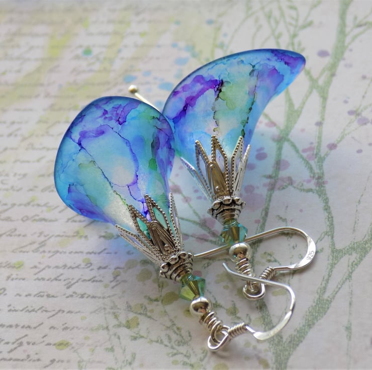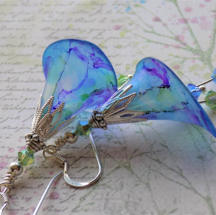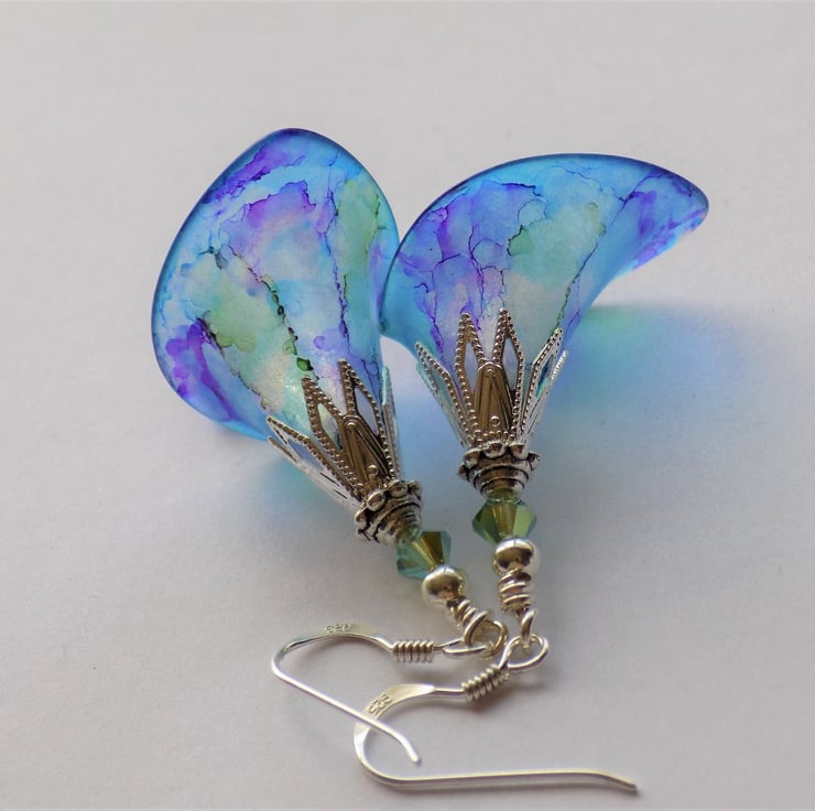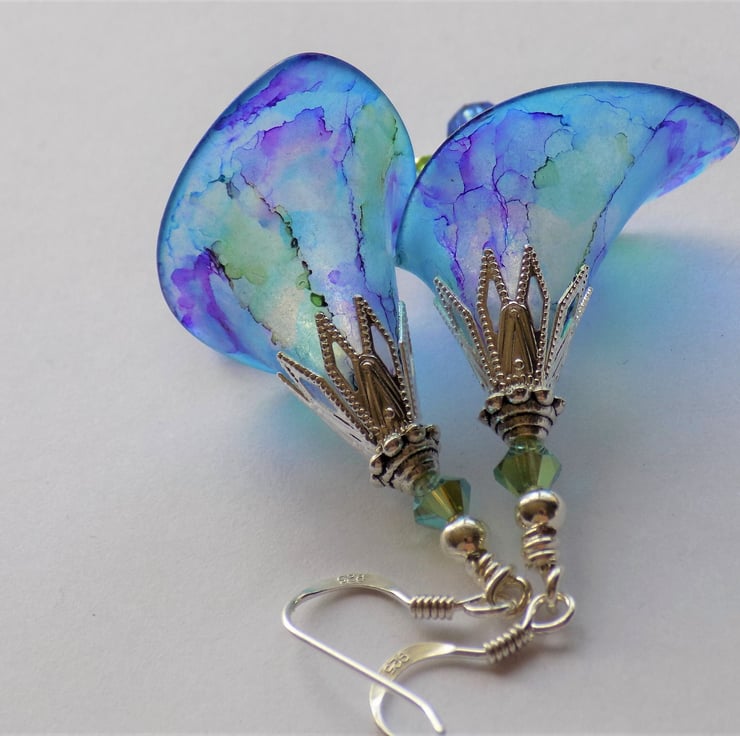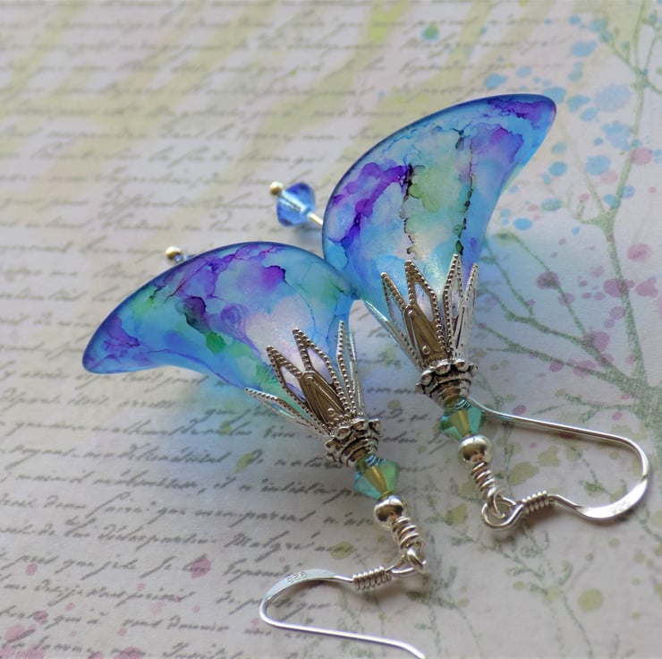 These gorgeous earrings have a blue background, with plum, purple and green marbling. They were inspired by some beuatiful irises in flower in our garden. They have detailed silver plated bead caps and 'stamens' of Swarovski Crystal Bicones in matching colours. They are shown with 925 sterling silver hooks, but you may choose your desired ear wires from the drop-down menu.