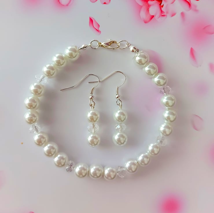 8mm Glass Pearl & Crystal Bracelet & Earrings Set in Card Gift Box.