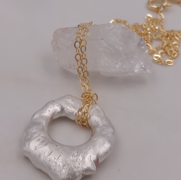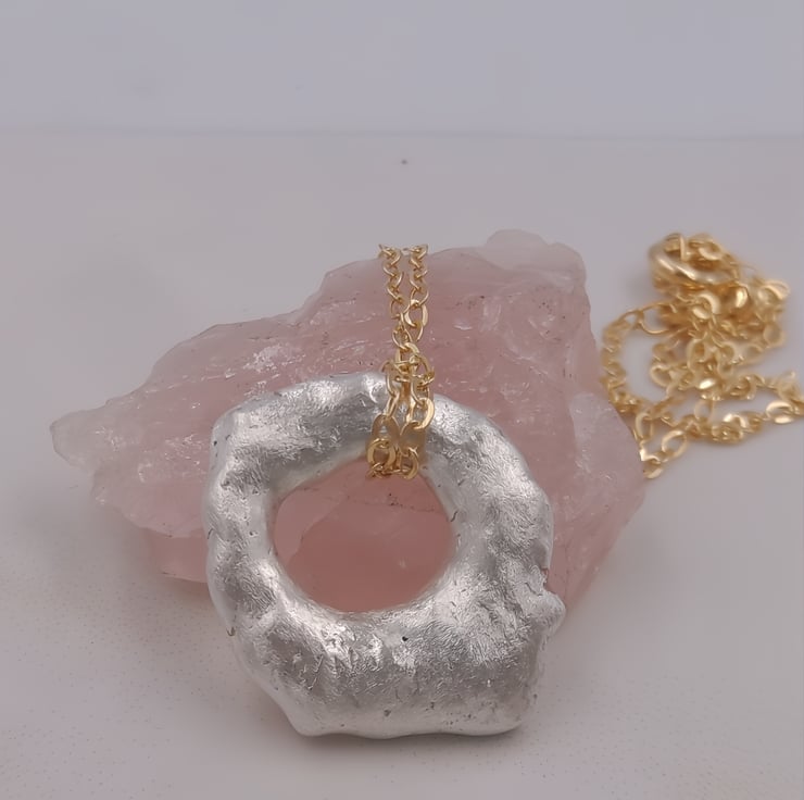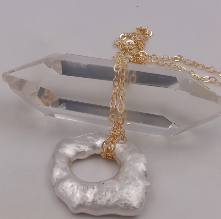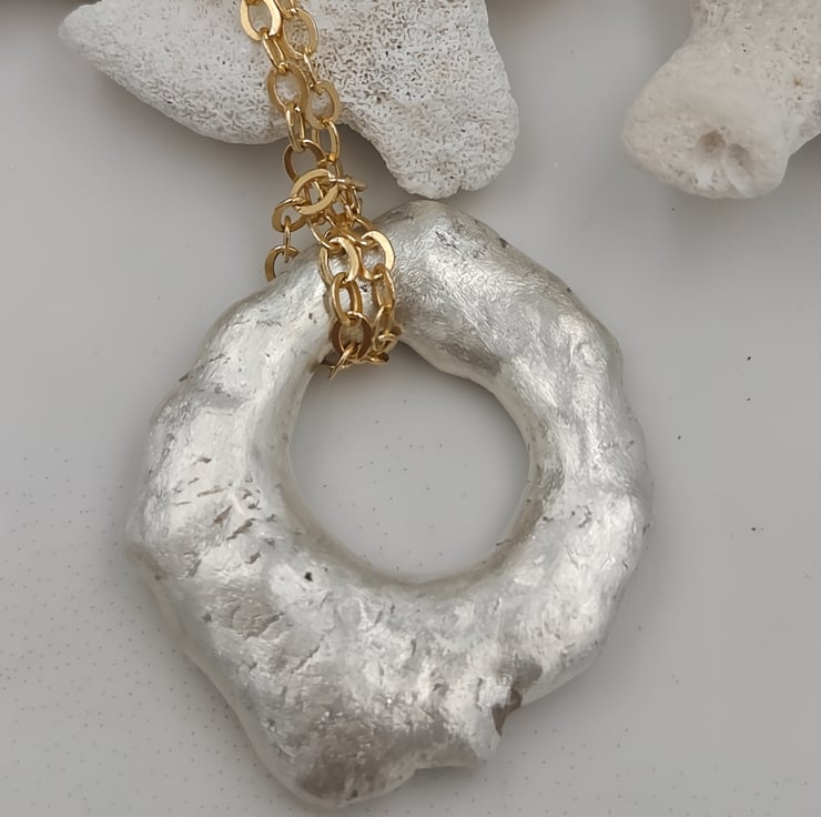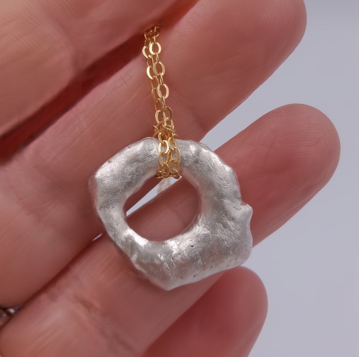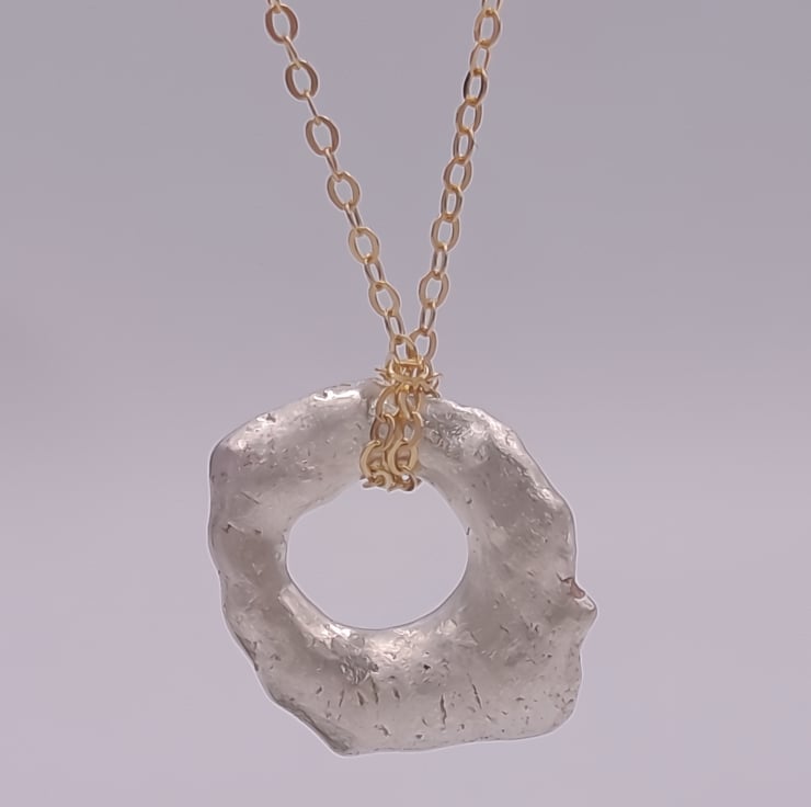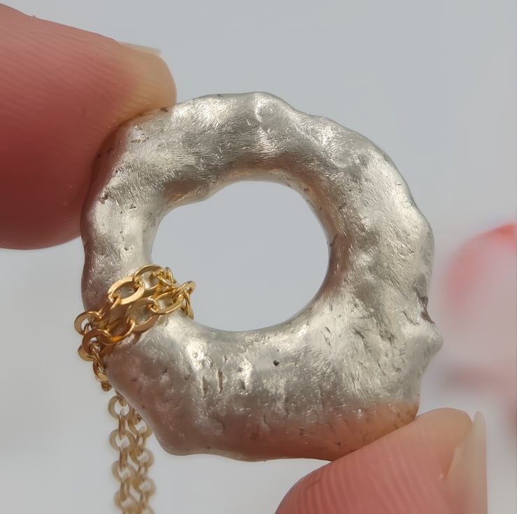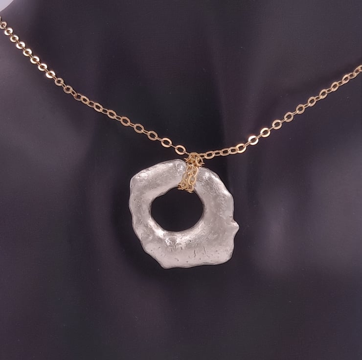 Discover the raw beauty of organic design with this Molten Silver Irregular Circle Pendant Necklace. Featuring a bold, sculptural pendant with a fluid, molten texture, this piece captures the essence of modern elegance and artisanal craftsmanship. The irregular circle shape adds a unique, handcrafted touch, ensuring no two pieces are exactly alike.