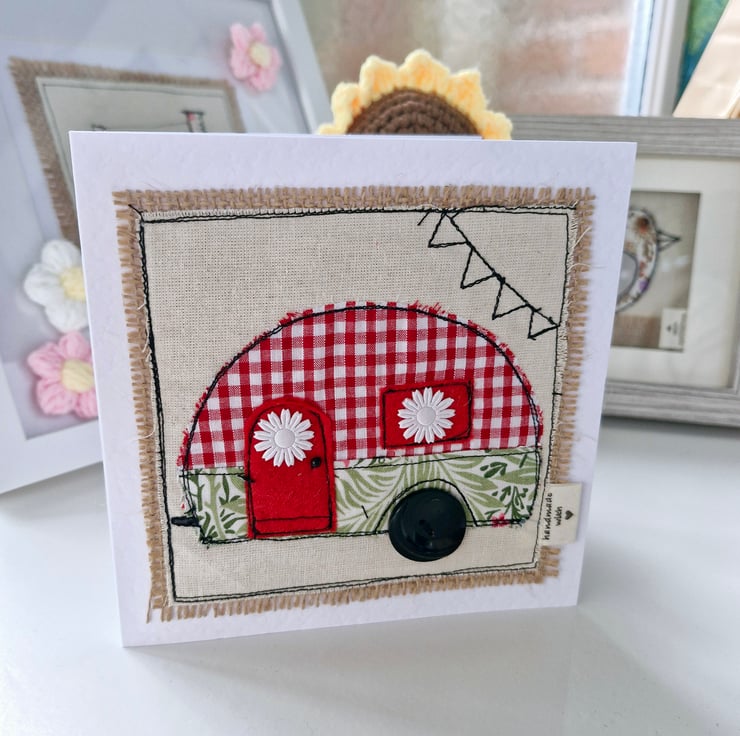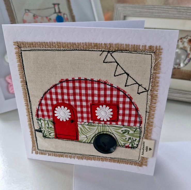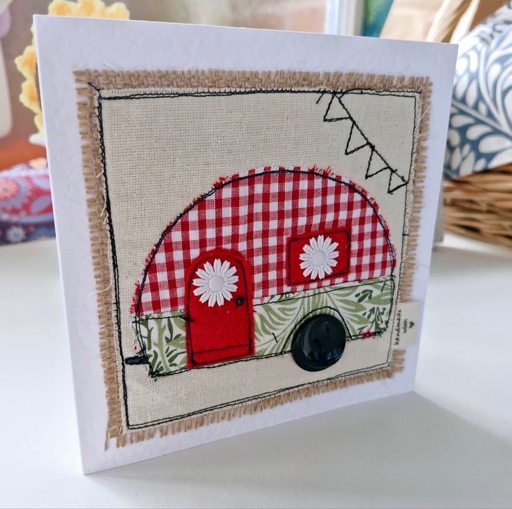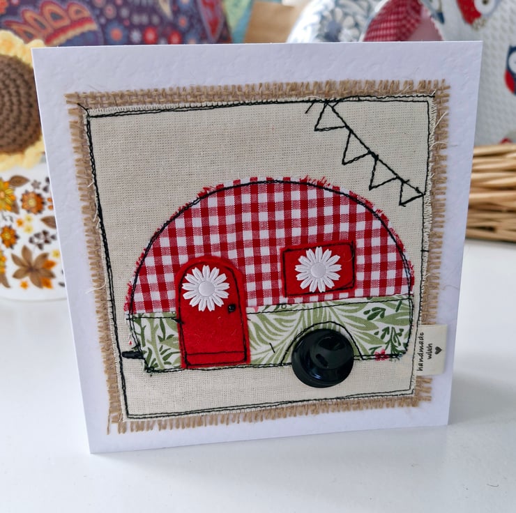 A high quality card, this features a fabulous caravan design. Using a free motion embroidery technique, the card has been decorated with embellishments.