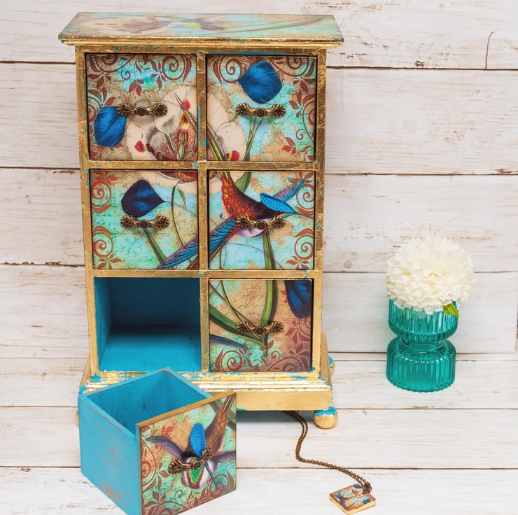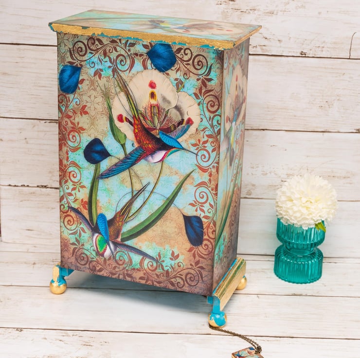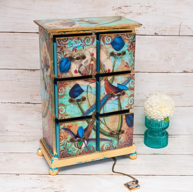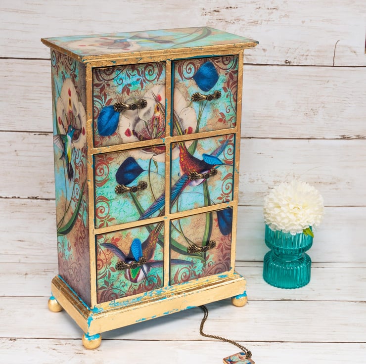 Beautiful vintage chic, Hummingbirds jewellery box / armoire with 6 drawers. This beautiful mini chest of drawers is decoupaged in a gorgeous vintage style, with my own unique humingbirds design, with gold leaf detail.