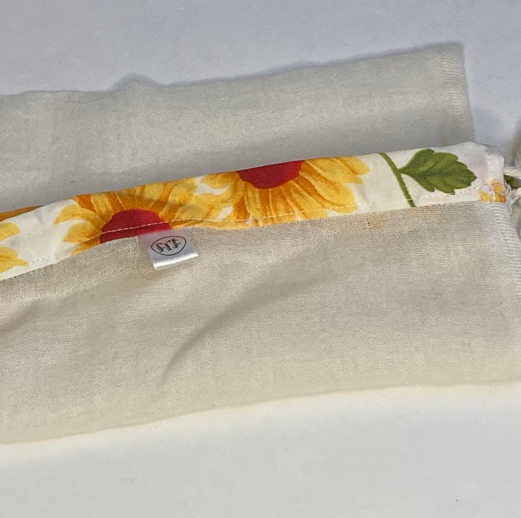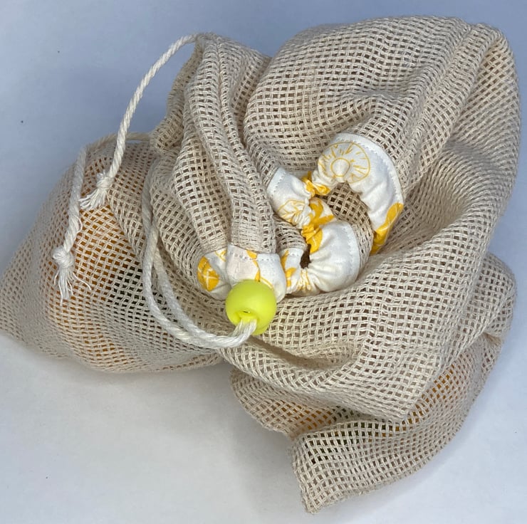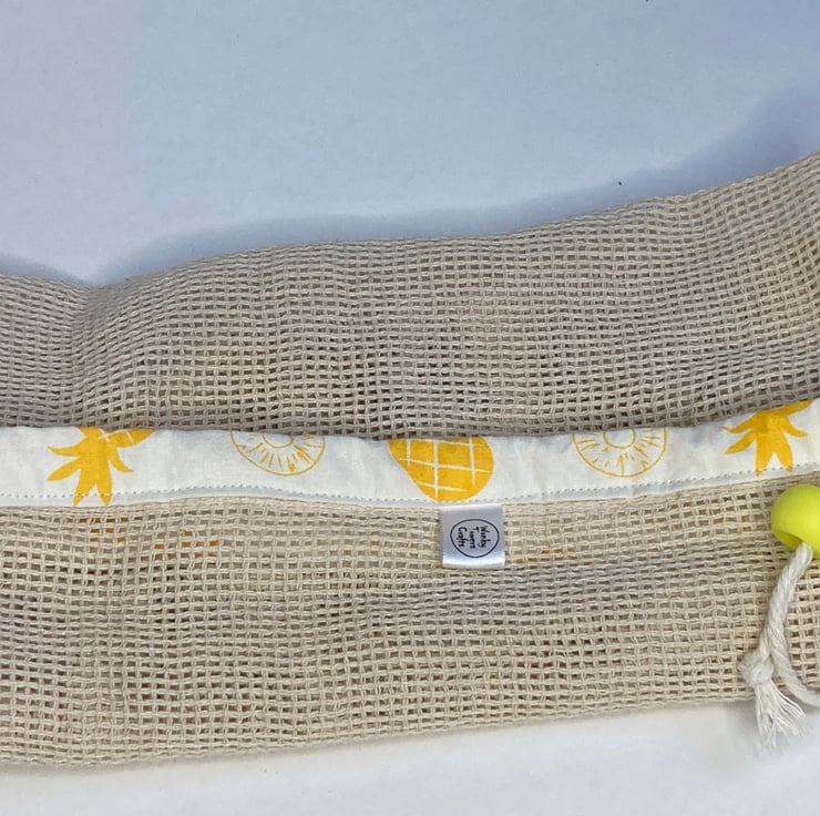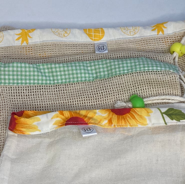 This set includes three different sized drawstring bags, made from cheesecloth and cotton mesh and topped with a lovely cotton trim. They are great for keeping your fruit and veg safe in the supermarket, farm shop or greengrocers. The cotton fabric allows produce to breathe and not sweat and so is also ideal for storage in the fridge too. The simple drawstring design with a coloured cord-lock will keep your purchases safe and the pretty, edging, decorated in shades of yellow and green, will help you to identify the bags as your own.