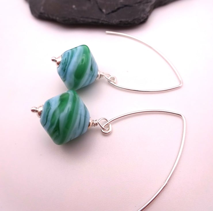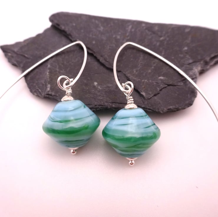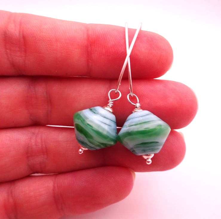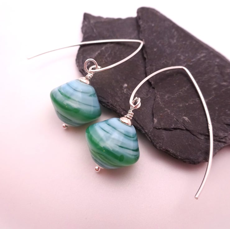 A pair of earrings made with sterling silver ear wires and handmade lampwork green glass beads.