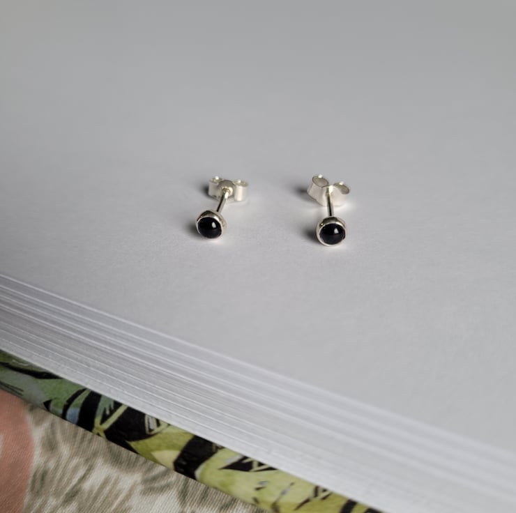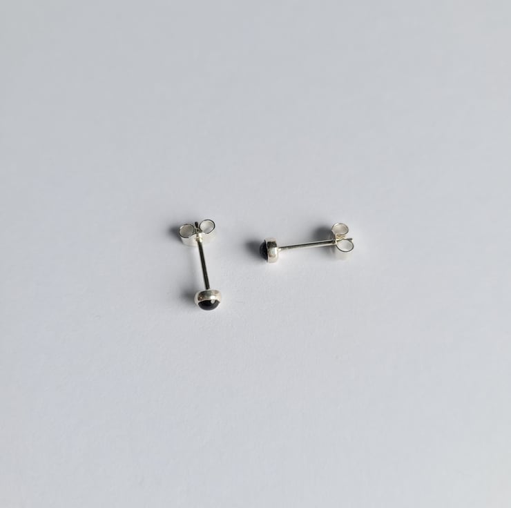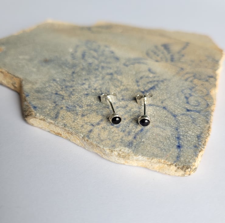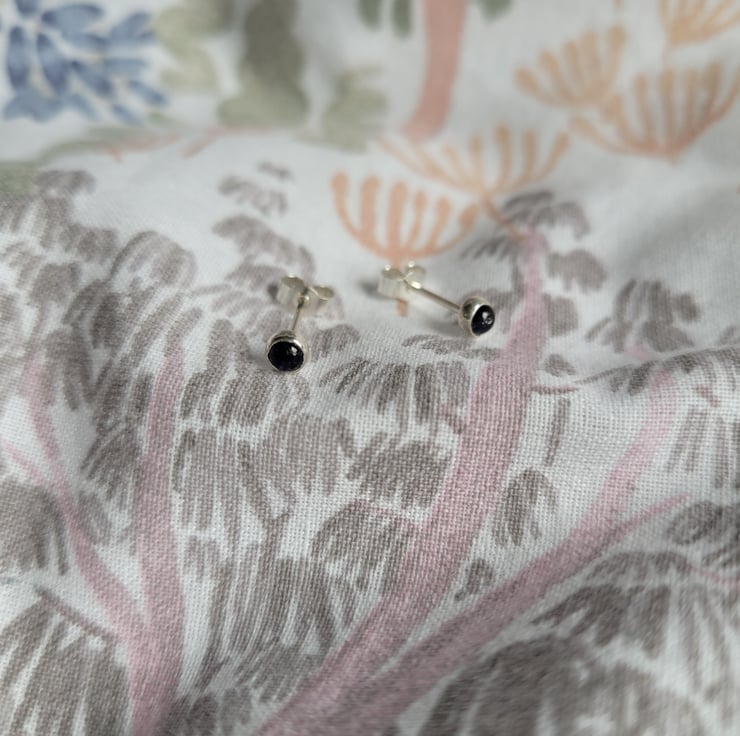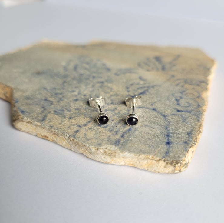 Tiny small 3mm dark blue iolite stones have been hand set into handmade recycled sterling silver stud earrings. The studs are finished with recycled sterling silver scroll backs.