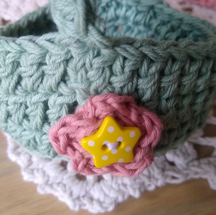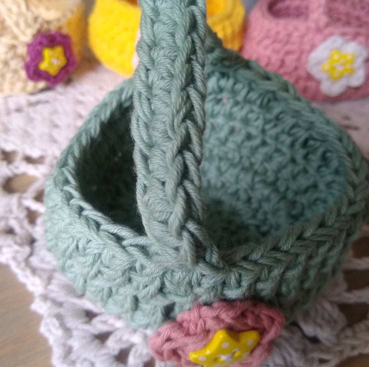 Please note that although I have made these with two strands of yarn for durability, these baskets are not toys and will not withstand rough treatment.