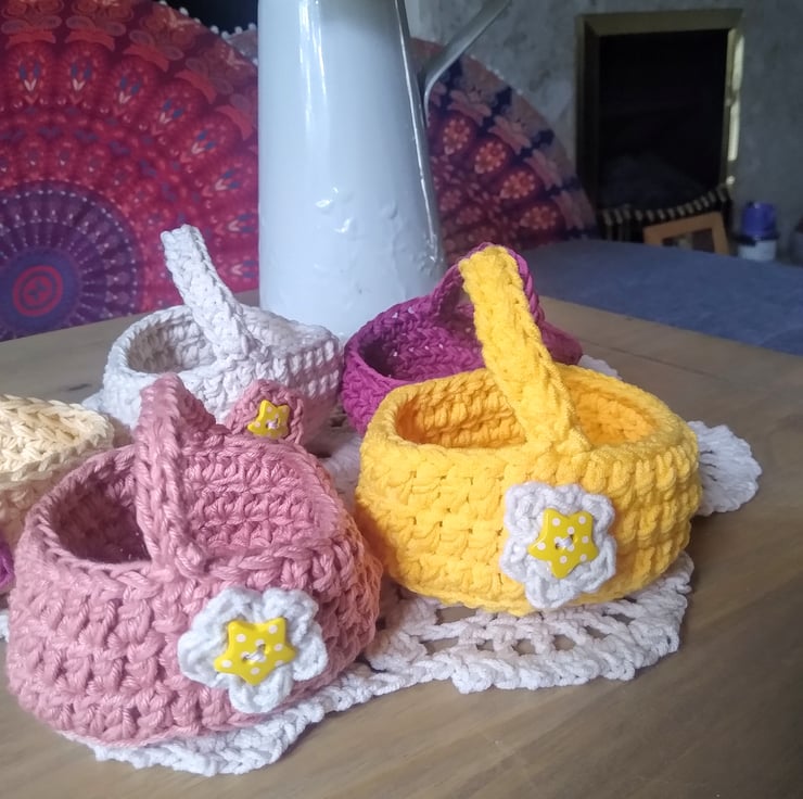Each basket features an applique flower in a contrasting colour that's held in place with a colourful button.