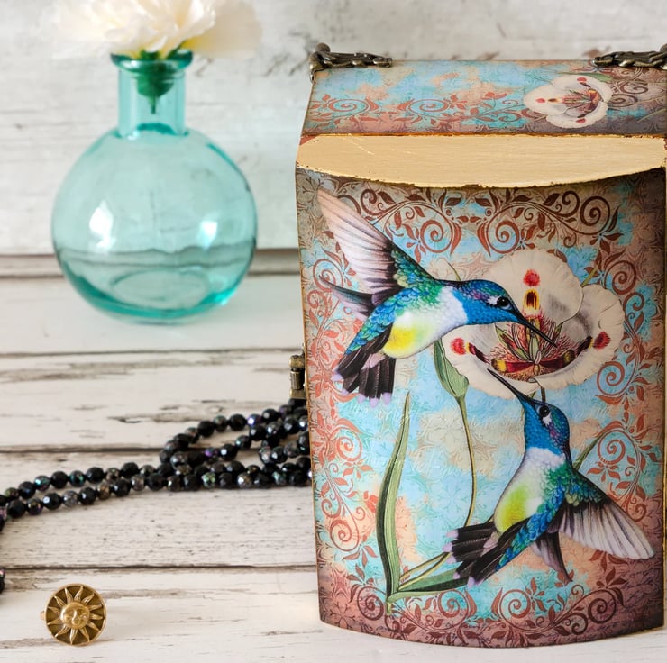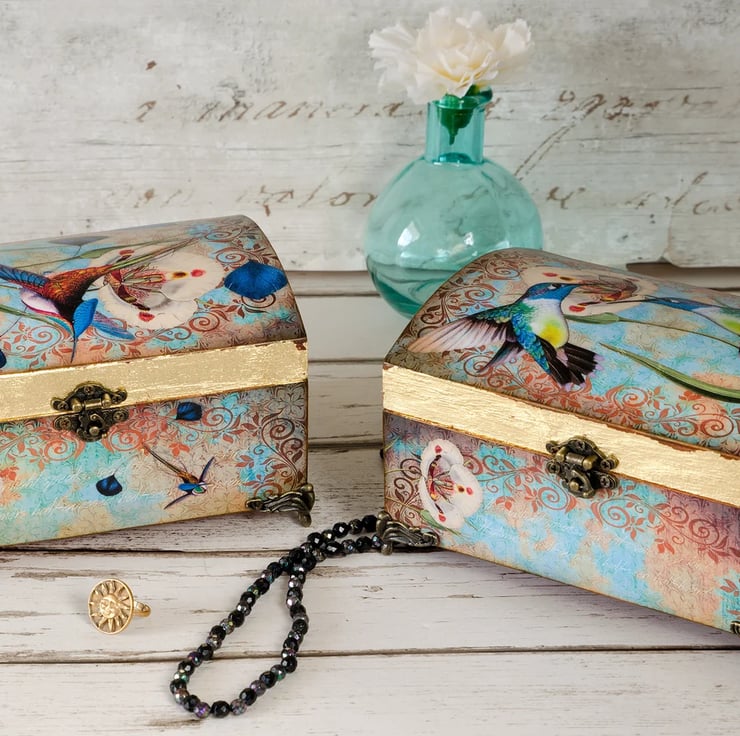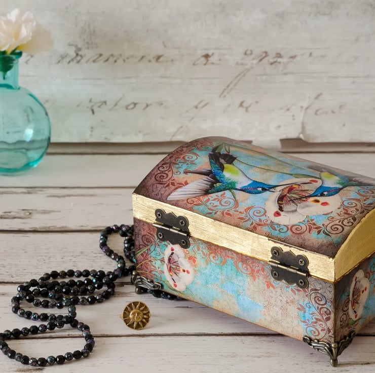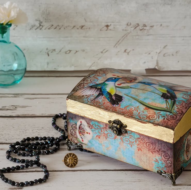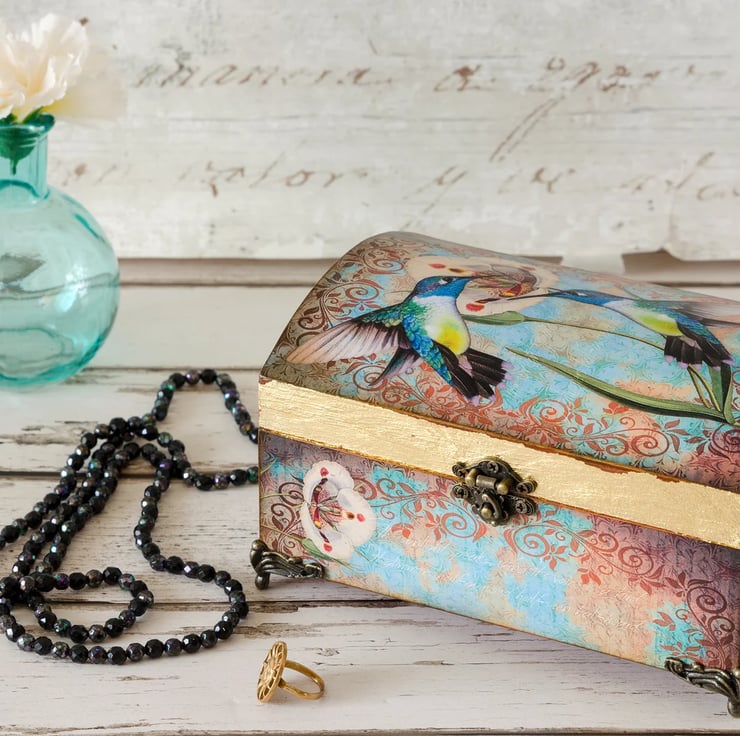 Gorgeous vintage style hummingbird jewellery box, chest decoupaged with vintage hummingbirds and gilded with gold leaf.