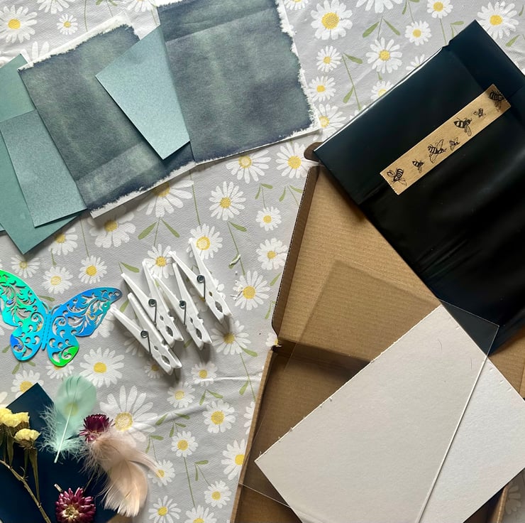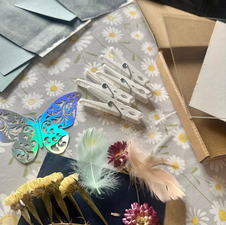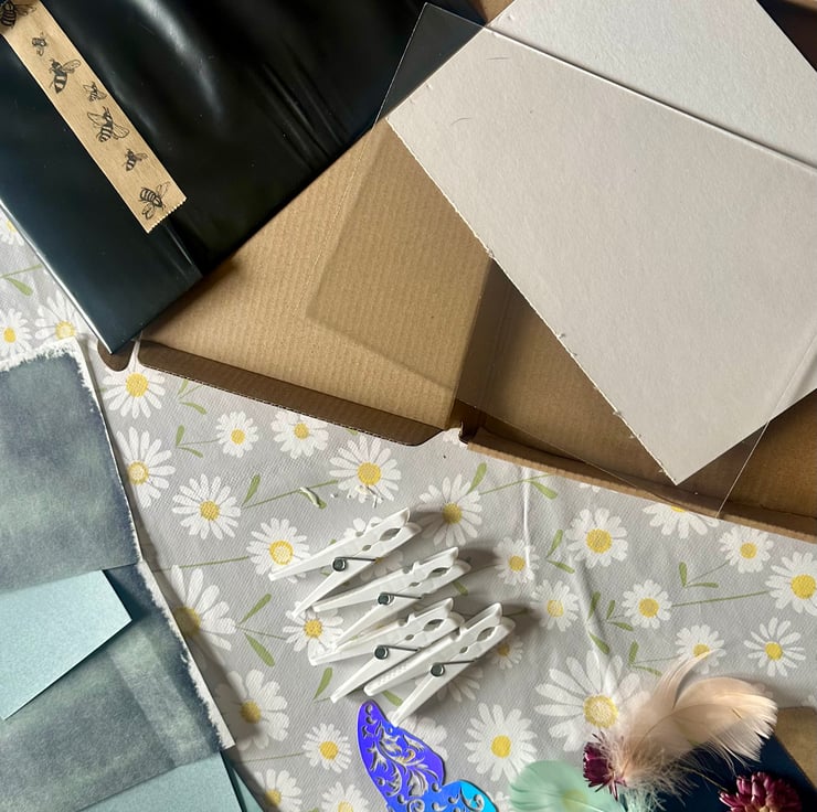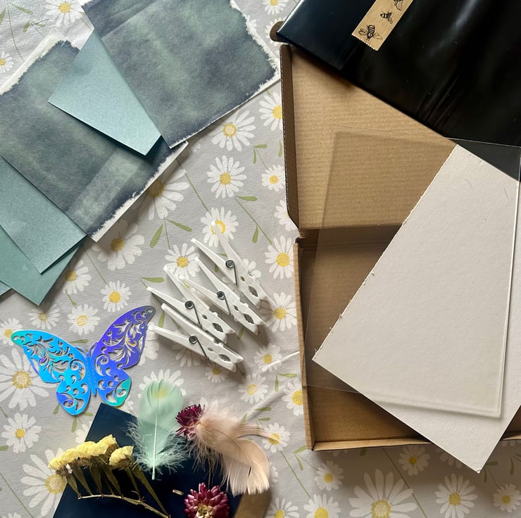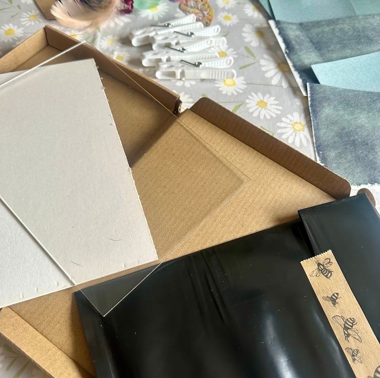 Your kit will arrive in a small, eco-friendly brown box (slightly larger than A5), with everything needed to create your prints. Feel free to add your own materials like pressed flowers or other objects for unique designs!