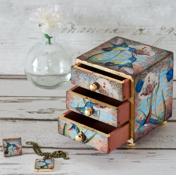 Beautiful mini chest of drawers jewellery box in a gorgeous shabby chic design with vintage hummingbirds and gold leaf detail.
