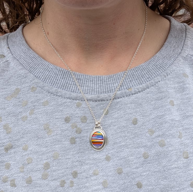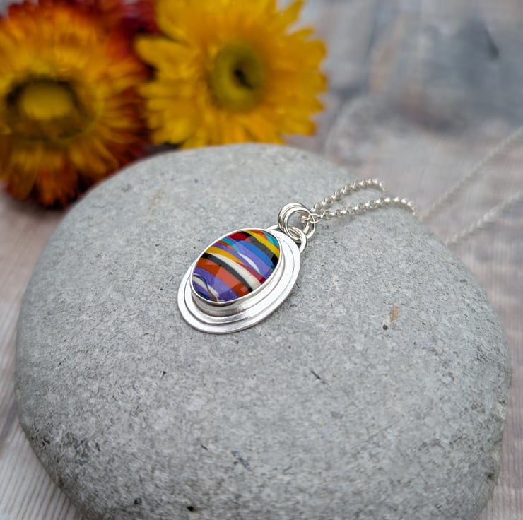 This handmade necklace features a vibrant Surfite cabochon set in recycled sterling silver. The Surfite stone, formed from layered resin drips left over from surfboard making, measures approximately 12 x 16mm and is full of bold, joyful colours in unique stripy patterns.