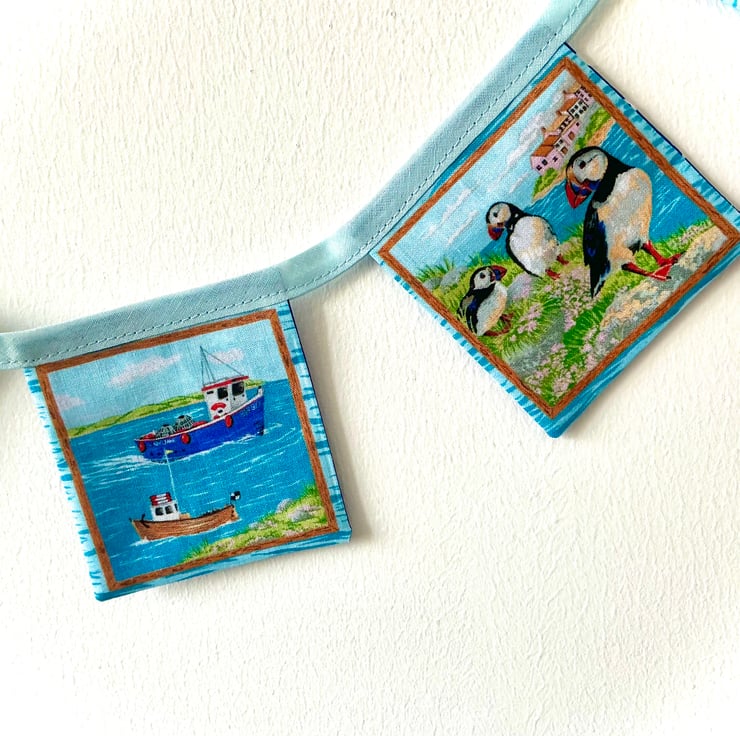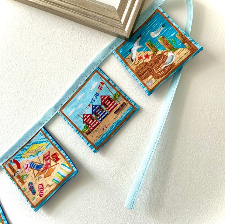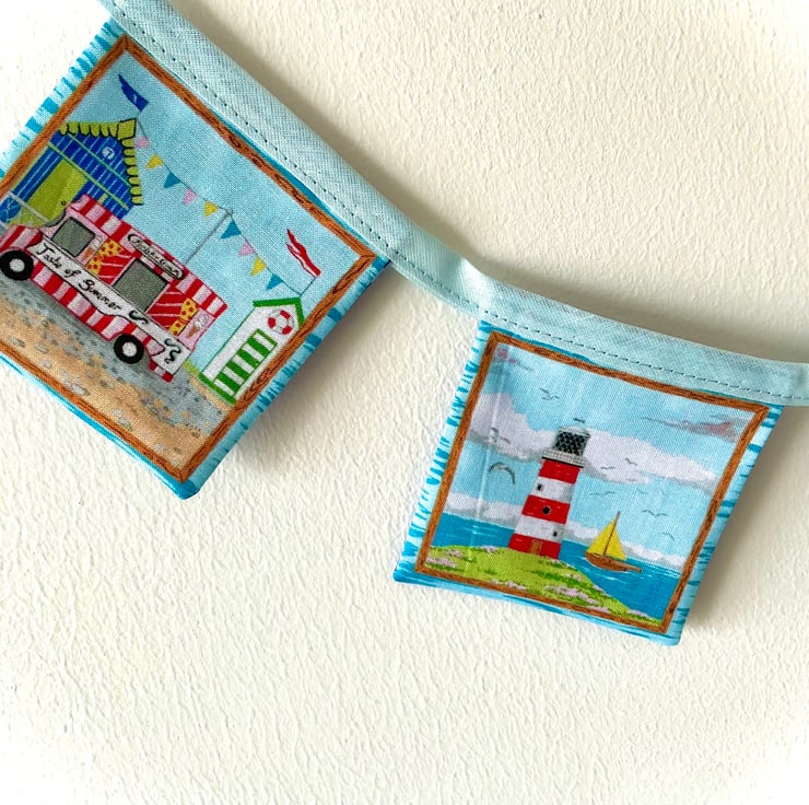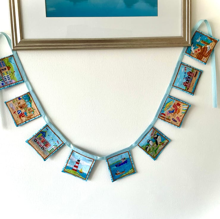 Square design bunting with the cutest individual seaside scenes. Each little picture is approx 3.5” square (9cm) and there are 9 panels per strand. The 9 panel length is 40” with 15” tie at either end.