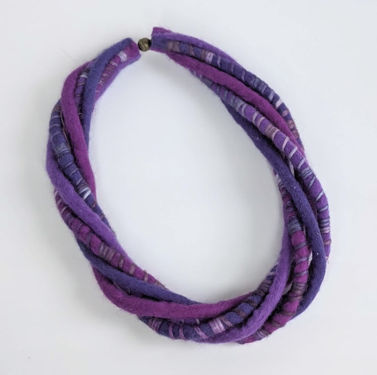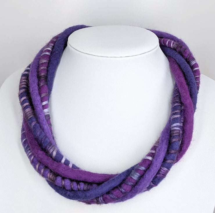 This handmade wet felted necklace twists together felted cords of soft merino wool in shades of purple and deep violet, wrapped with a toning lustrous merino and silk blend yarn. It closes with a strong magnetic fastening.