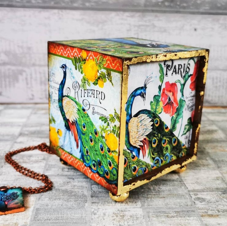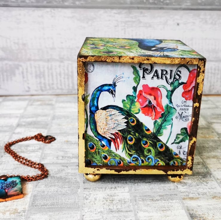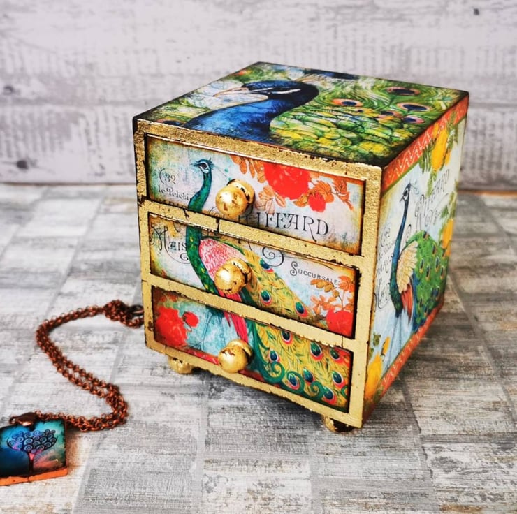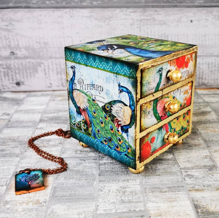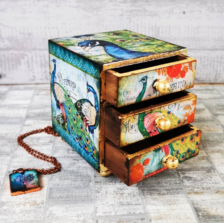 Beautiful Peacock Mini Chest of Drawers in a shabby chic, vintage style. This jewellery box has gilded bun feet and drawer pulls and is decoupaged on all sides so that it can be stood in front of a mirror, or on a dressing table. Perfect for storing jewellery, trinkets, make up and bits and bobs.