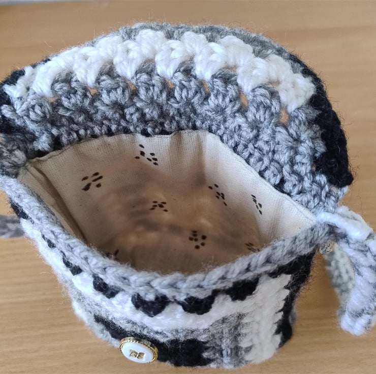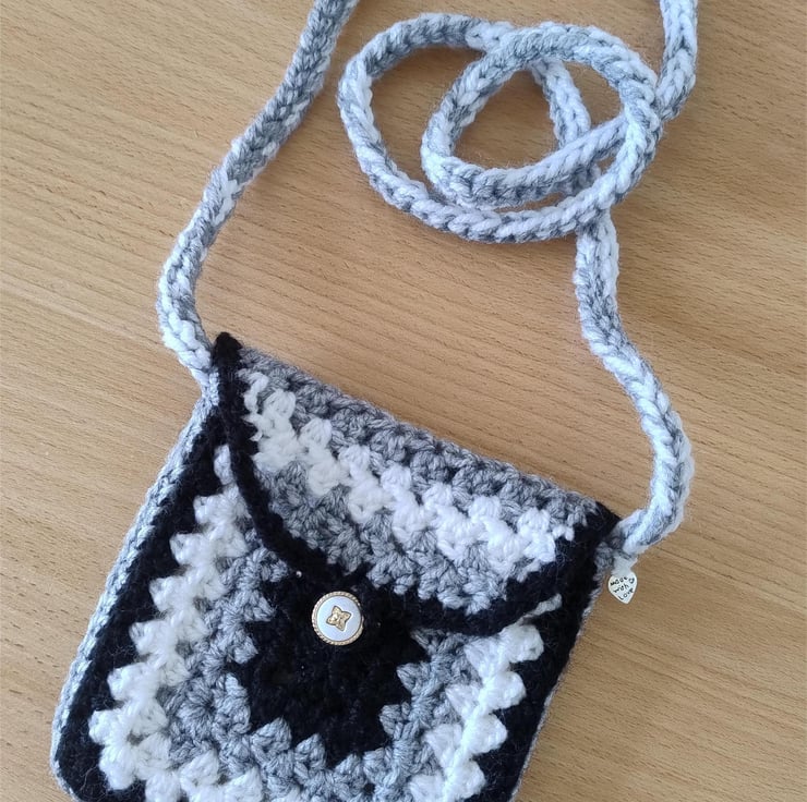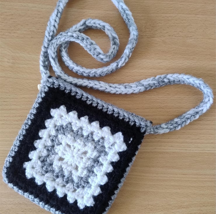 This little purse is crocheted in the Granny Square Style in black, grey & white acrylic yarn.