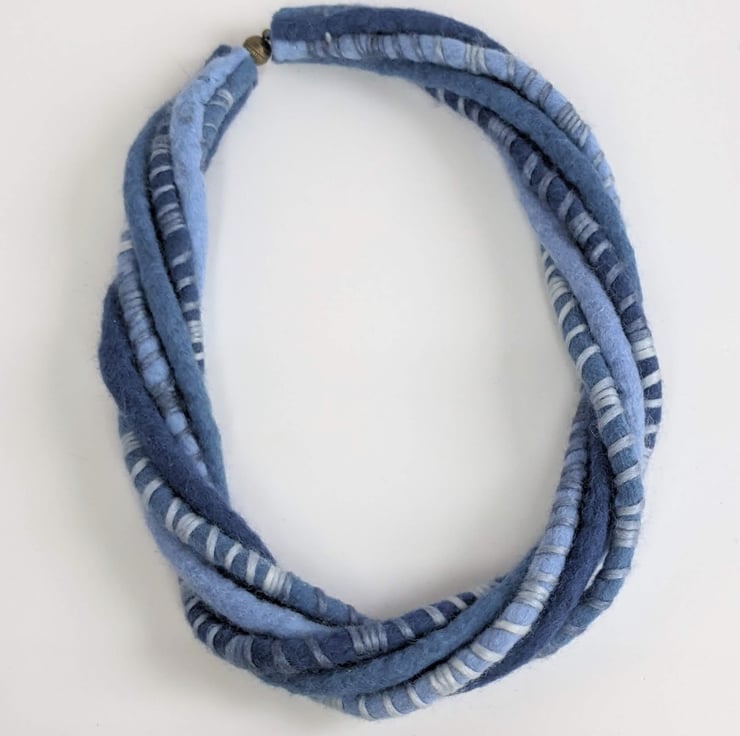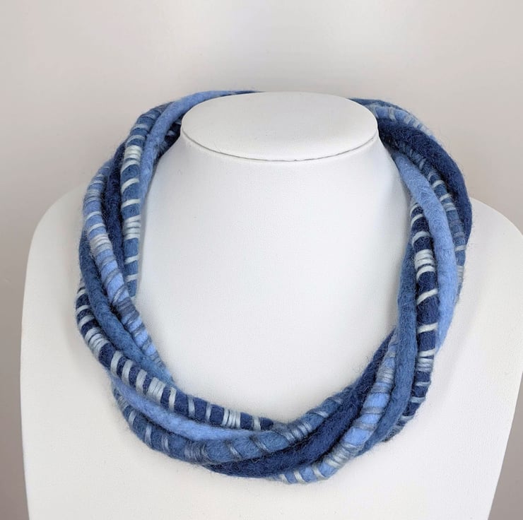 This handmade wet felted necklace twists together felted cords of soft merino wool in shades of denim blue, wrapped with a toning lustrous merino and silk blend yarn. It closes with a strong magnetic fastening.