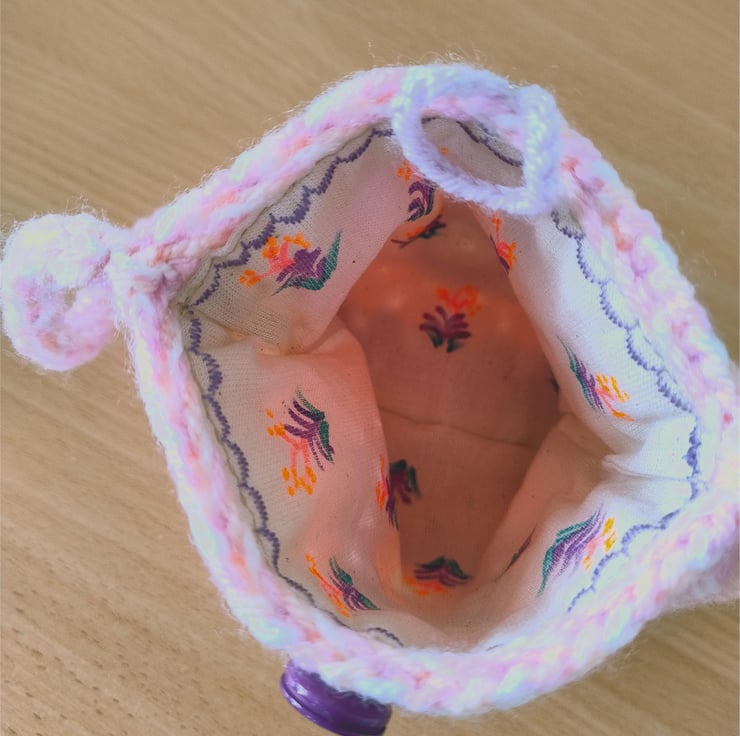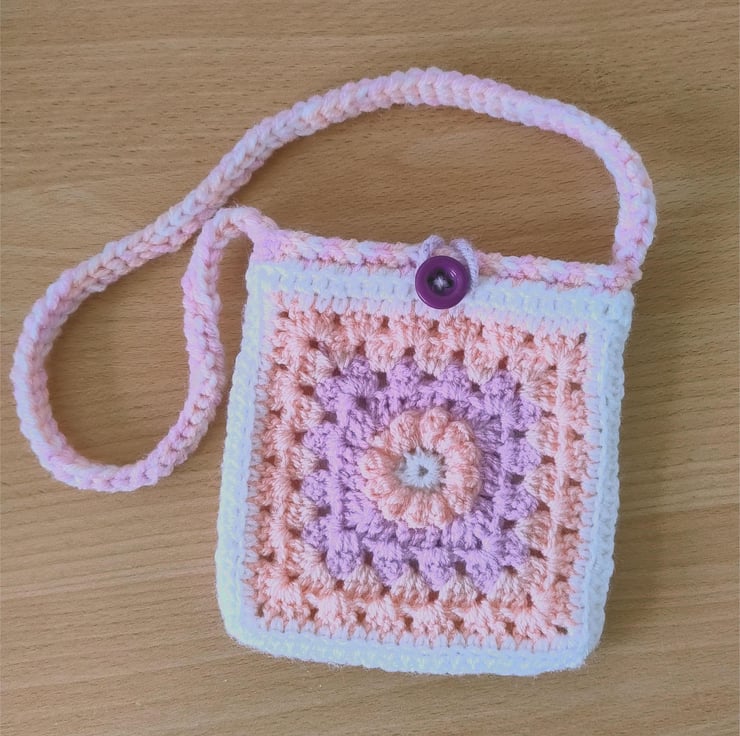 This little purse is hand crocheted in the Granny Square Style from 100% acrylic yarn in lilac, peach and white. It features a crocheted shoulder strap, a hand decorated cotton calico lining and fastens with a little button & loop fastening.