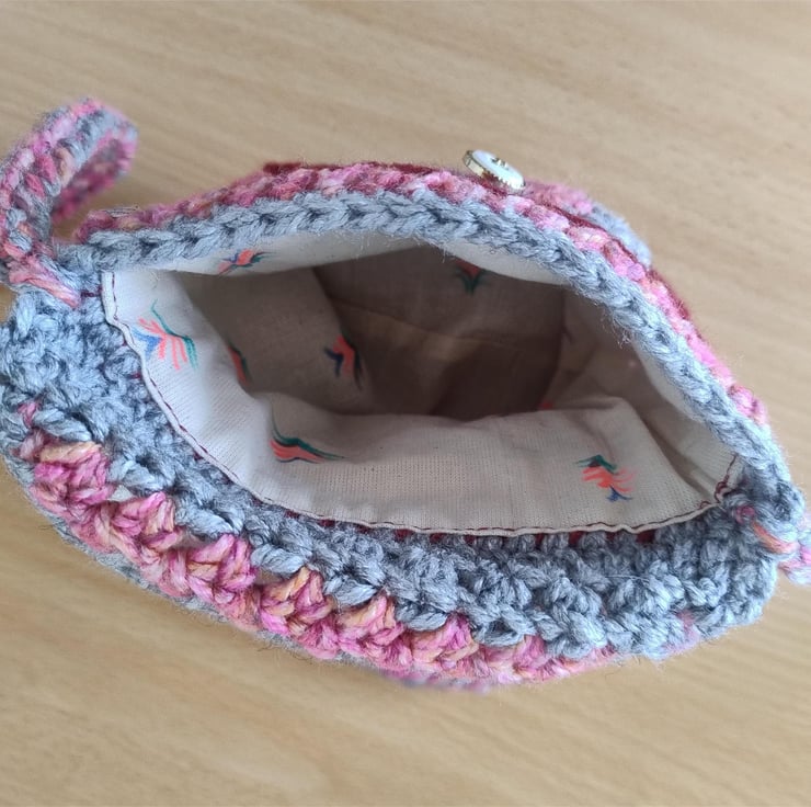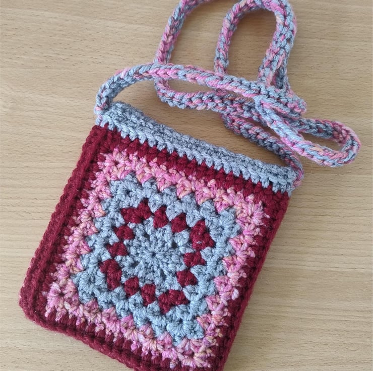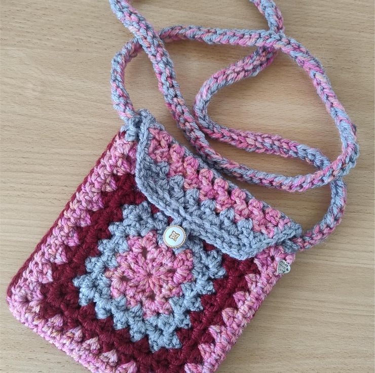 This little purse has been hand crocheted in the Granny Square style from acrylic/wool mix yarn in red, grey and pink. It features a long strap, hand decorated cotton calico lining and fastens with a little white and gold effect button & loop fastening.