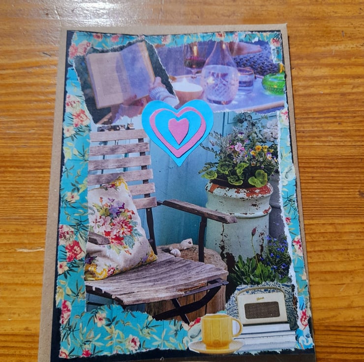 My love of junk journalling has evolved to creating junk cards. I enjoy nothing more than relaxing in my garden with a good book, the radio and a cup of tea, which is the inspiration for this unique, one off card.